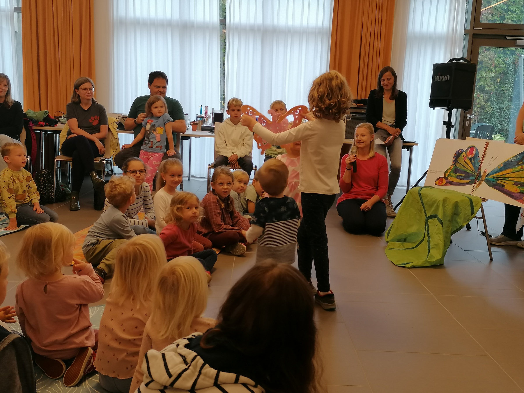Eines dieser Wunder ist die Raupe, sie ist ein besonderes Tiere weil sie sich verwandelt. Sie wird ein ganz anderes Tier- ein Schmetterling. Um sich das auch vorstellen zu können haben wir das Buch der Raupe Nimmersatt mitgebracht. Sie hat sich durch viele verschiedene Früchte und Nahrungsmittel durchgekostet. Als sie satt war hat sie sich zu einem Kokon verpuppt und wurde schließlich nach einiger Zeit ein wunderschöner Schmetterling. Dies hat die Kinderaugen leuchten lassen.