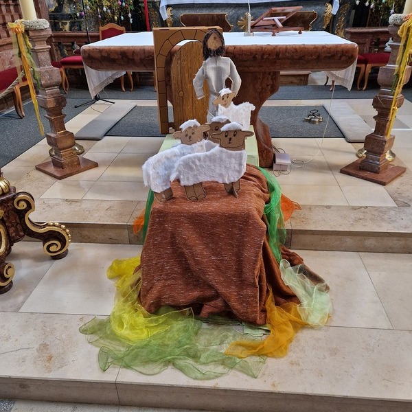 Am 26.04.2026 gestalteten wir gemeinsam mit den Erstkommunionkindern diesen Jahres eine Familienmesse. Die Lesung aus dem ersten Brief des Apostels Petrus spannte mit dem abschließenden Bild einer Schafherde, die ihrem Hirten folgt den Bogen zum Evangelium, in dem es um Jesus, "den guten Hirten" ging. Passend hierzu entstand, begleitet von kurzen Impulsen, ein Bild von Jesus mit uns, seinen Schafen. Jesus als Tür zum richtigen Weg wurde ebenso thematisiert wie die Fußspuren, die darauf hinweisen, dass wir immer mit Jesus unterwegs sind.