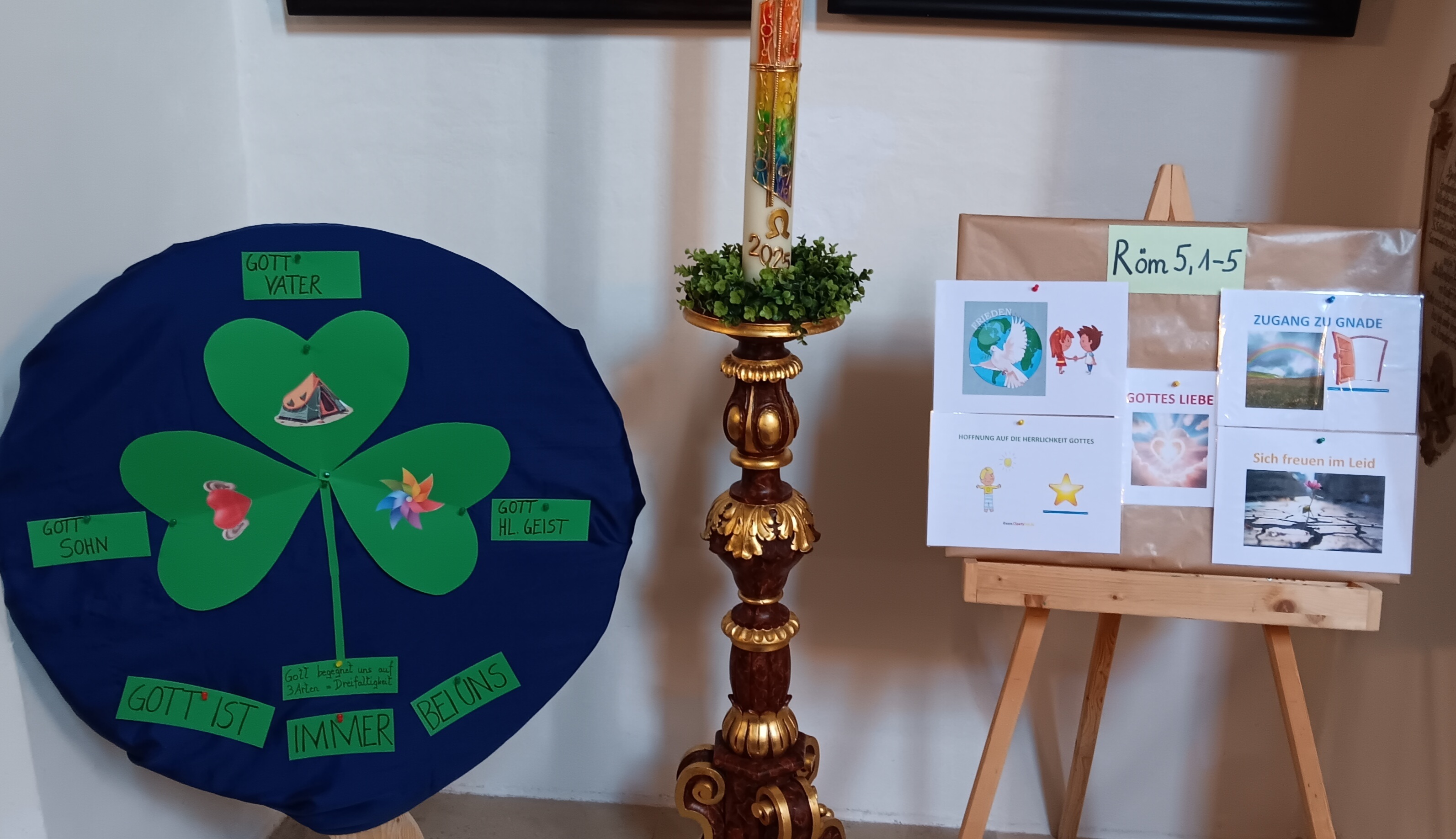 Bei dieser Familienmesse nahmen wir den Dreifaltigkeitssonntag zum Anlass, um uns auf kindgerechte Weise dem doch nicht ganz einfachen Thema der Trinität anzunähern. Mit Hilfe von zwei anschaulichen Beispielen, einem Kleeblatt – das erst durch seine 3 einzelnen Blätter zu einem „ganzen“ Kleeblatt wird und einer Kerze mit drei Dochten sowie dazu passenden kurzen Texten wurden die Anwesenden an das Thema herangeführt, wohl wissend, dass wir die wahre Größe Gottes wohl nie ganz erfassen werden können, worauf H. Hermann Josef in der Predigt noch näher einging.