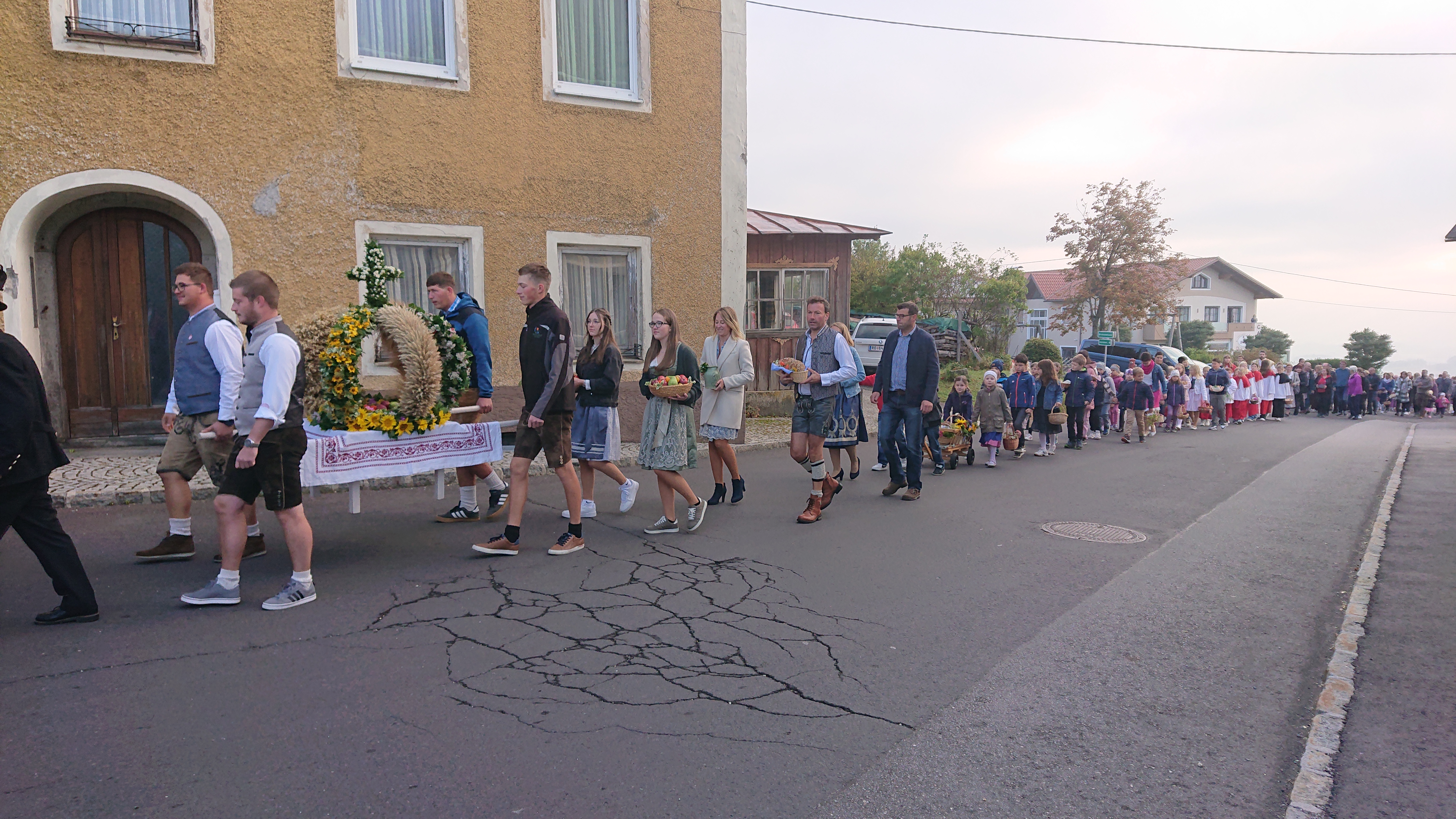 Ein langer Zug an Personen ist heuer wieder, trotz der frühmorgendlichen Uhrzeit (8:15 Uhr) vom Pfarrhof in die Kirche eingezogen, um Gott für die Gaben des ganzen Jahres zu danken. Vorneweg die Musikkapelle, der Bauernbund, die Trachtengruppe, die Jägerschaft mit der Jagdkrone, die Landjungend mit der Erntekrone, die Kinder von Volksschule und Kindergarten, alle Ministranten und eine große Zahl an Leuten mit Körben und Erntegaben. Besonders feierlich gestaltete der Familienchor die Festmesse. Iris und Daniel Stadler brachten stellvertretend Brot und Wein als Erntegaben zum Altar. Mit einem stimmungsvollen Danklied zu Ehren Gottes leisteten die Volksschul- und Kindergartenkinder einen wertvollen Beitrag zur Gestaltung der Messe.