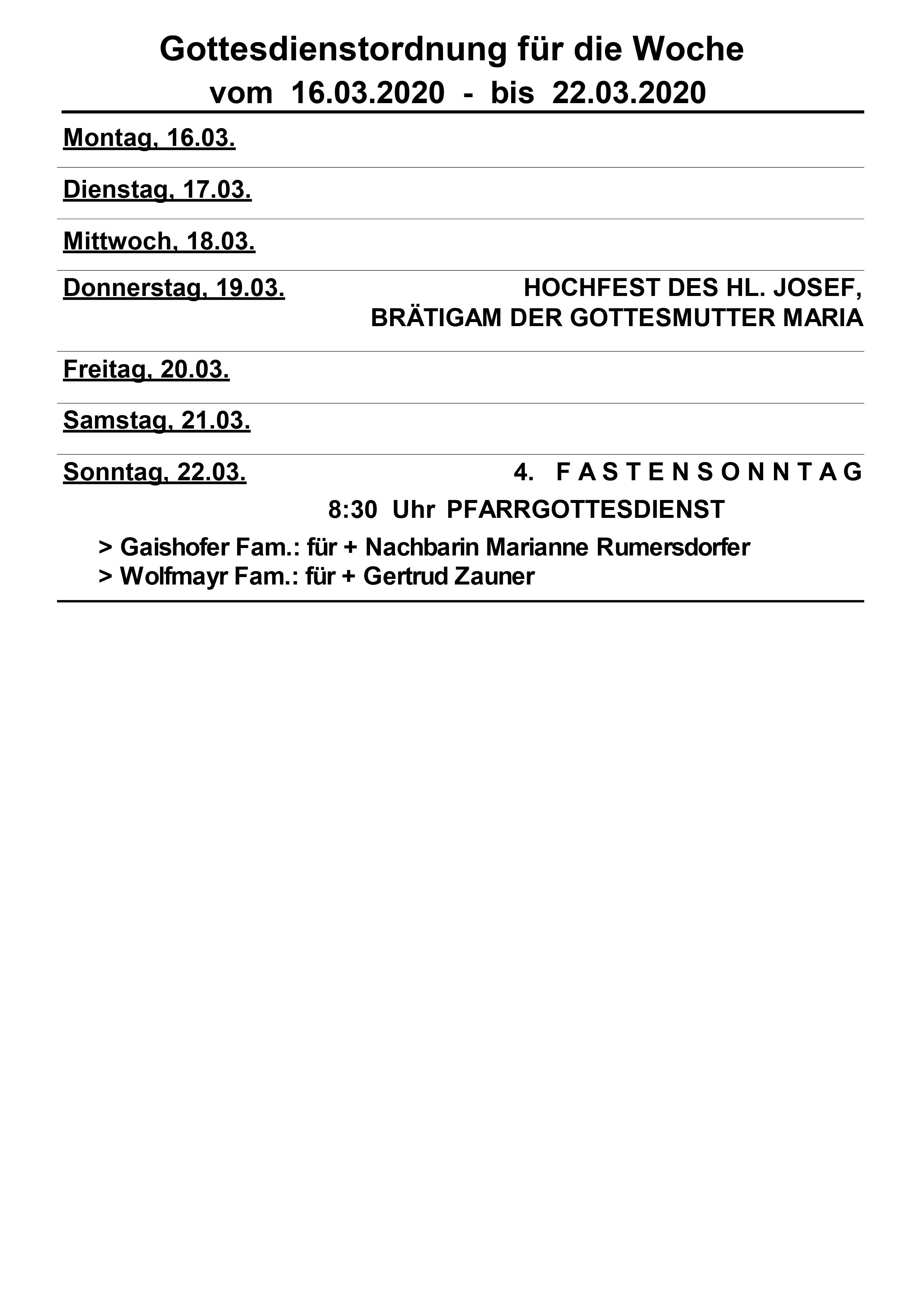 Ein herzliches „Grüß Gott“ allen, die sich, bedingt durch die veränderten gesetzlichen Rahmenbedingungen nicht in der Pfarrkirche, sondern Zuhause zum „virtuellen Pollhamer Sonntagsgebet“ Zeit nehmen. Der heutige Sonntag trägt in der Tradition unserer katholischen Kirche die Bezeichnung „Laetare“ - was übersetzt heißt: Sich freuen, seine Freude über irgendein Ereignis zum Ausdruck bringen. Der heutige Sonntag steht somit im Zeichen der Vorfreude auf das Osterfest. Schon jetzt, noch mitten in der Fastenzeit, klingt die Osterfreude über die Erlösungstat und die Auferstehung Jesu an. Vielleicht brauchen wir gerade in Krisenzeiten diesen hoffnungsfrohen Ausblick, damit das Vertrauen nicht schwindet.