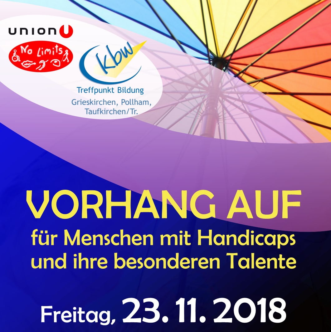Etwa 300 Menschen wurden am 23. November 2018 in der Manglburg Grieskirchen Zeugen dieser vielfältigen Fähigkeiten. Die KBW Treffpunkte Bildung von Grieskirchen, Pollham und Taufkirchen/Tr. hatten mit Union No Limits OÖ zu „VORHANG AUF für Menschen mit Handicaps und ihre besonderen Talente“ eingeladen. Mehr als 60 Mitwirkende haben berührt und mit ihrer Freude „mitgerissen“: Die Kinder-Theatergruppe von „Ich bin Ich“, die Prahlerei und Selbstherrlichkeit entlarvte. Die Multimediagruppe von assista, die über absolute No-Gos im Umgang mit Menschen mit Behinderung aufklärte. Der blinde Gitarrist Walter Stöger mit seinen selbstgeschriebenen Liedern, die Siebdrucker des Instituts Hartheim sowie der Maler und Zeichner Dietmar Ematinger aus Attnang. Die Musikschulgruppe vom Hof Schlüßlberg, die mit Witz auch selbst Geschriebenes vortrug. Die Jongleure, die Schattentheaterspieler und die Singgruppe vom Caritas-Institut St. Pius, der Gebärdenchor und der schwer hörbeeinträchtigte Trommler Sladan Coric von der Lebenswelt Schenkenfelden.