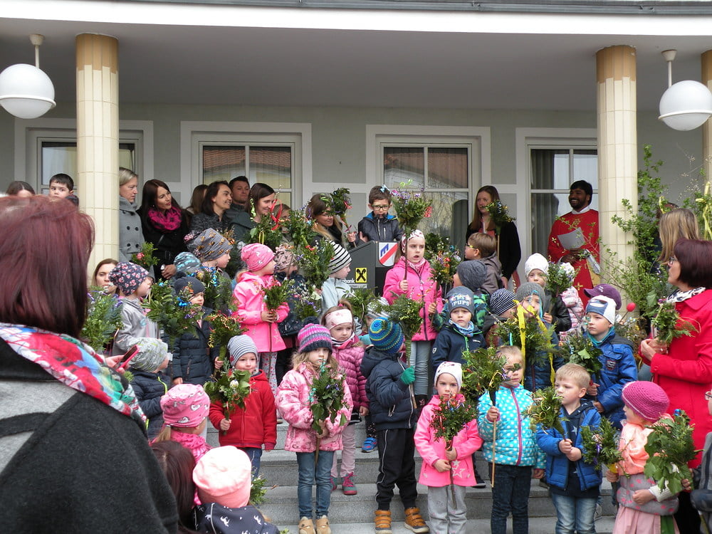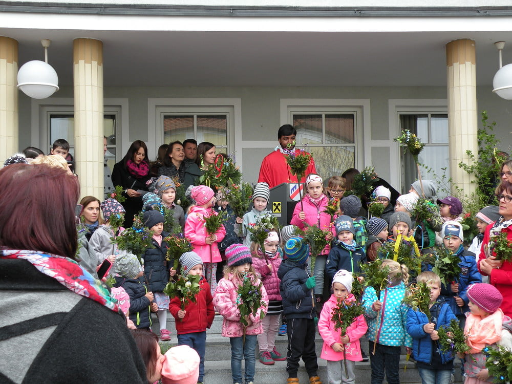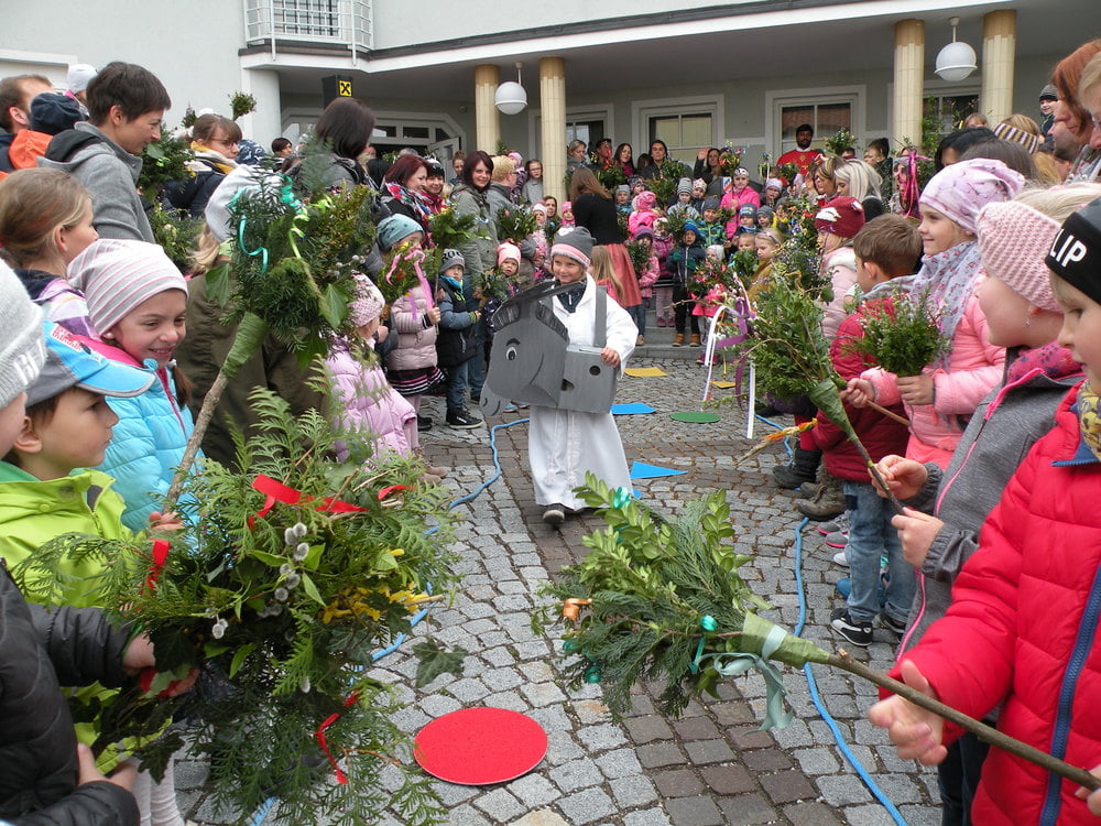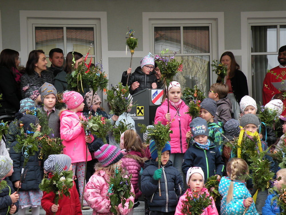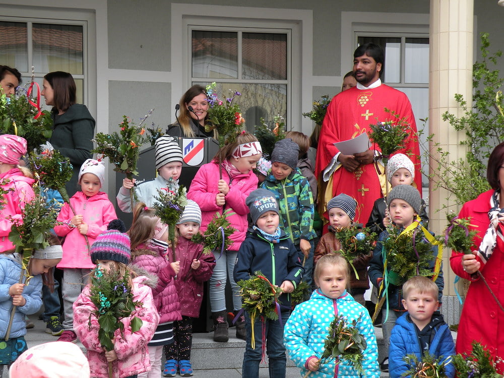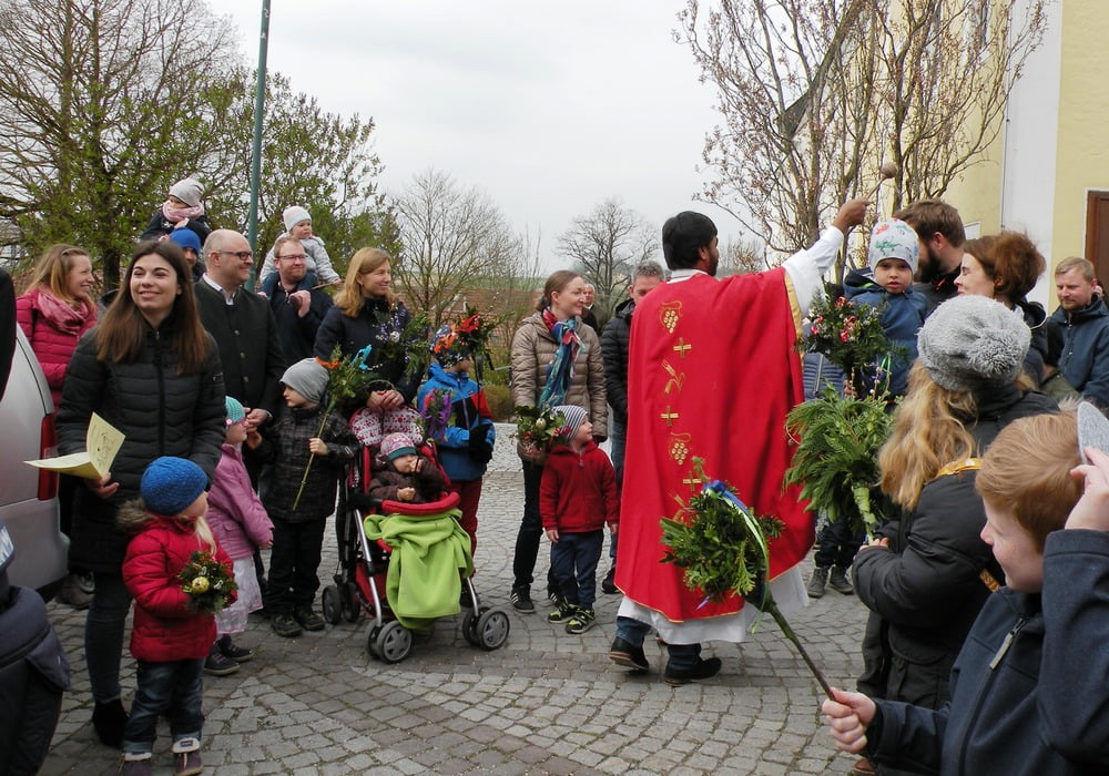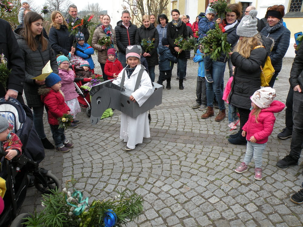 Vor dem Pfarrhof gestalteten wir mit den Kindern die Feier zur Palmweihe und dachten dabei des Einzugs Jesu in Jerusalem.