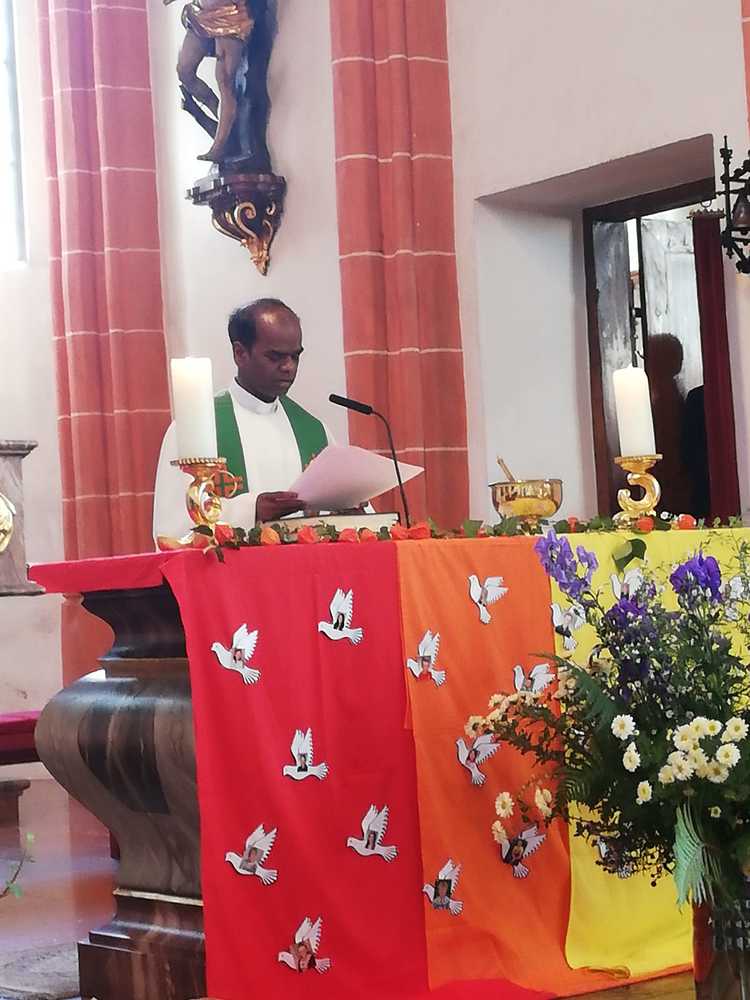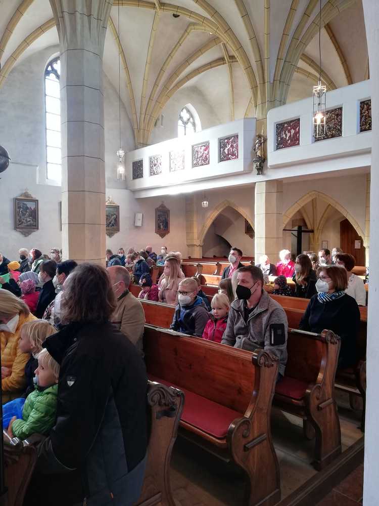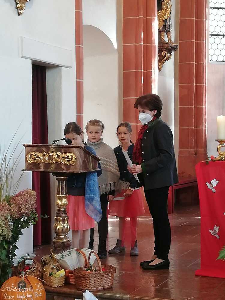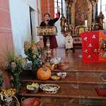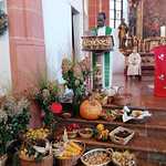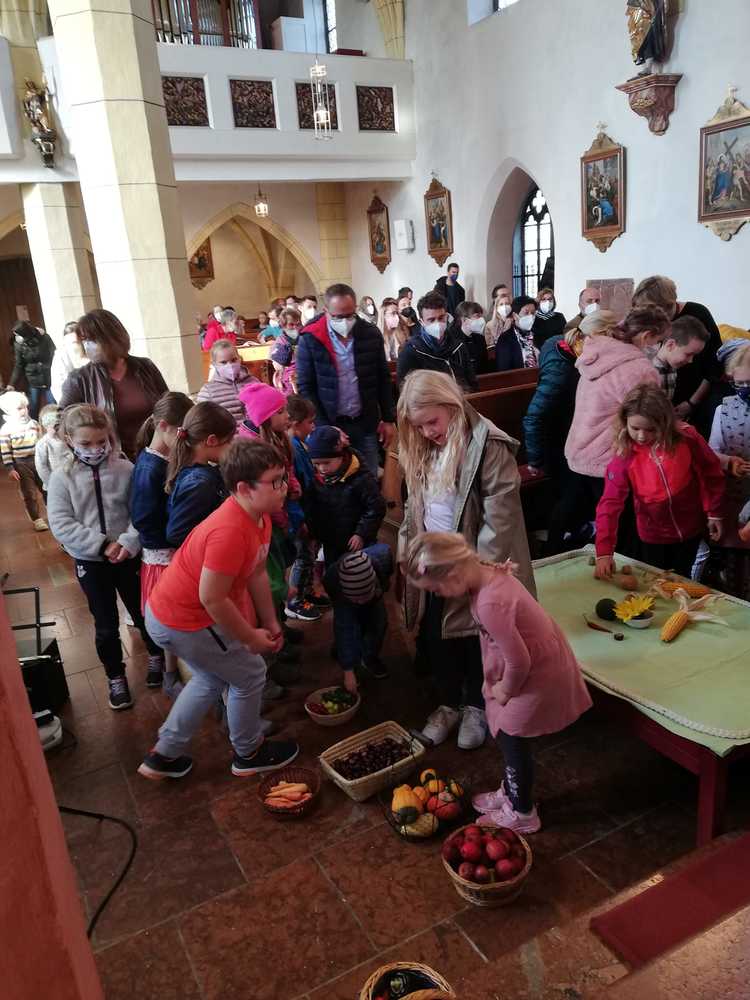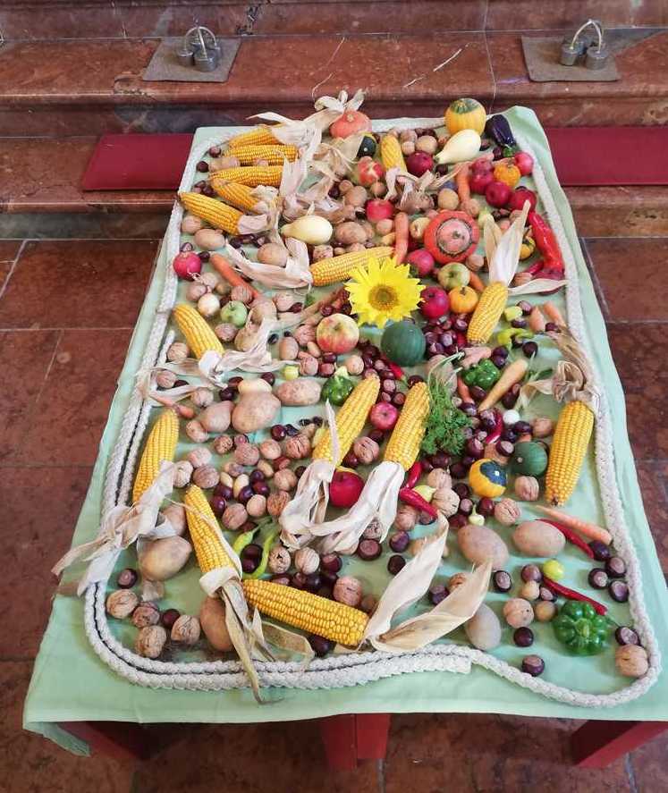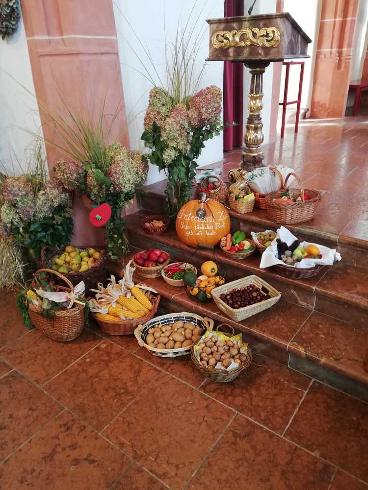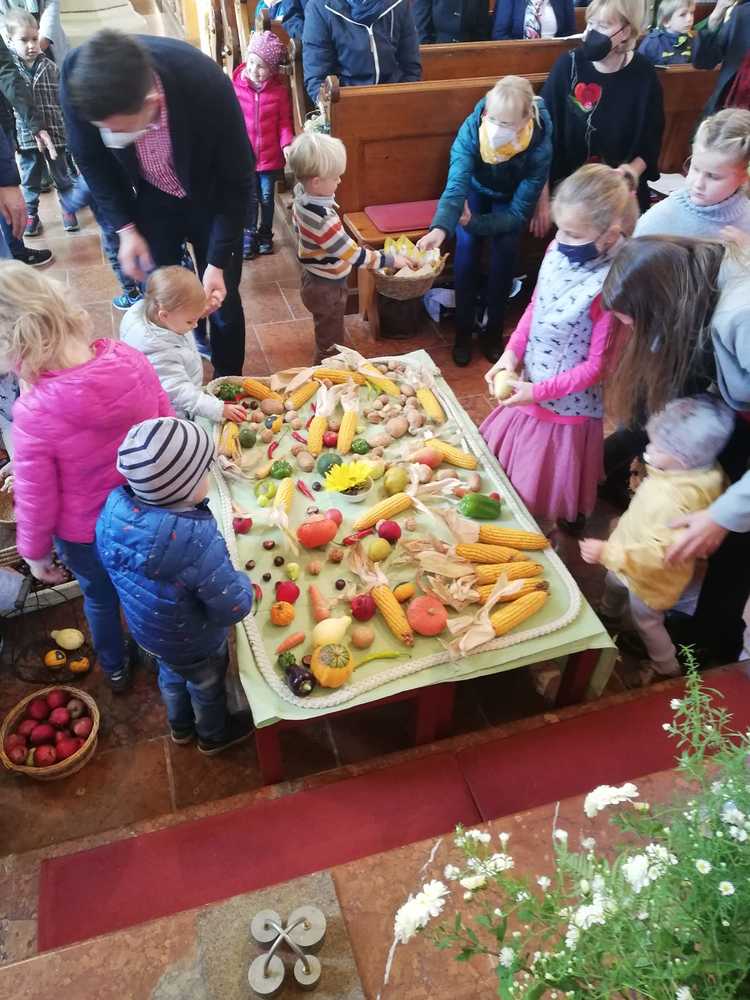 Bei herrlichem Herbstwetter wurde am Sonntag, 10. Okt. 2021 ein farbenfrohes Erntedankfest gefeiert. Die Kinder durften aus den verschiedensten Früchten ein wunderschönes Mandala legen, das noch eine Weile in der Kirche bewundert werden kann.
