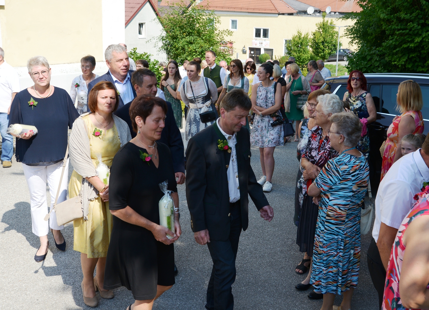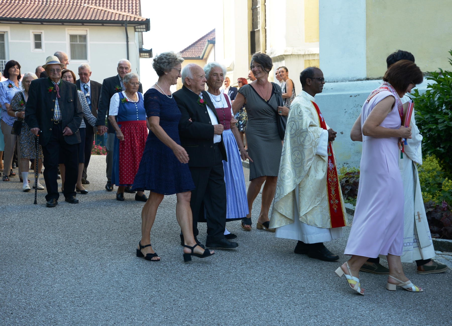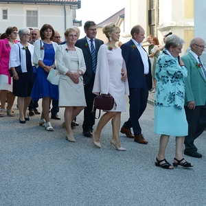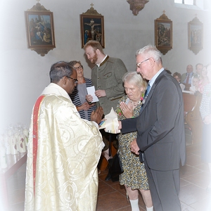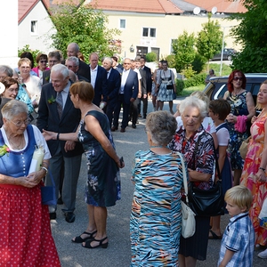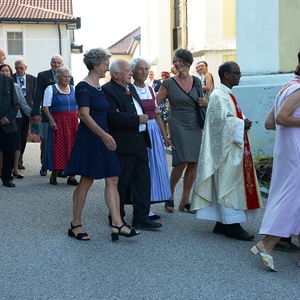16 Paare, die ihr Ehejubiläum feierten, zogen gemeinsam mit Franz Eschlböck, der sein 60-jähriges Priesterjubiläum feierte, unter Begleitung der Blasmusik zum Festgottesdienst ein. Kaplan Paul hat den Festgottesdienst geleitet und eine ansprechende Festpredigt gehalten. Dieser Festgottesdienst wurde vom Kirchenchor unter der Leitung von Helmut Lang in bewährter Weise musikalisch umrahmt.