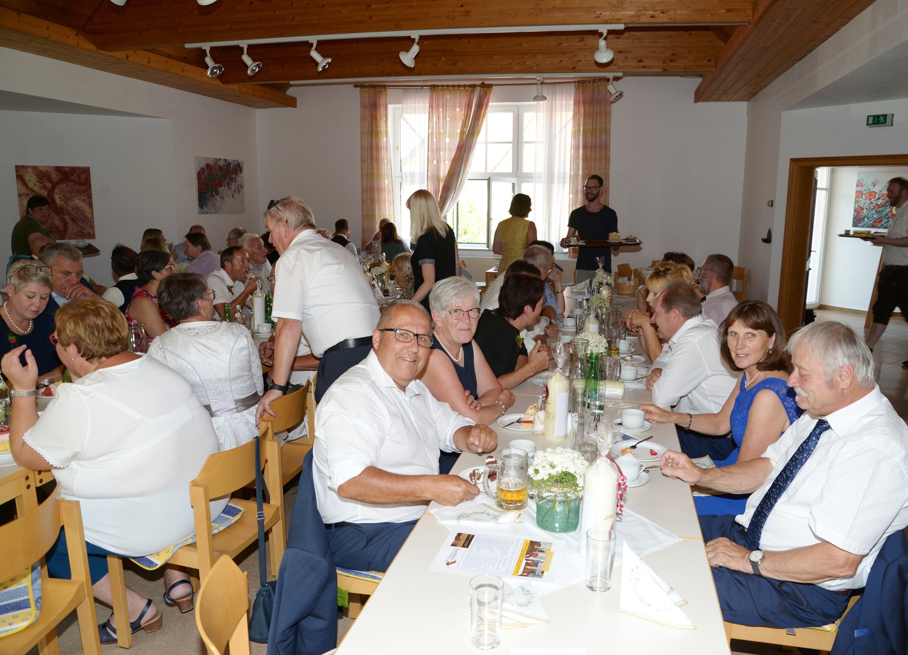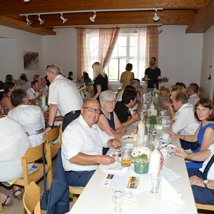 Beim anschließenden gemeinsamen Essen im festlich geschmückten Pfarrsaal konnten noch allerhand gemeinsame Erinnerungen und Neuigkeiten ausgetauscht werden. Als Ehrengäste waren aus der Pfarre EferdingerLand Pfarrer Klaus Dopler und Vorständin Sylvia Stockhammer, sowie BGM Herbert Holzinger mit seiner Frau Anita, Br. Markus und P. Dominik aus dem Haus Dachsberg und unser Pastoralassistent René Koppenberger-Drenik anwesend.
