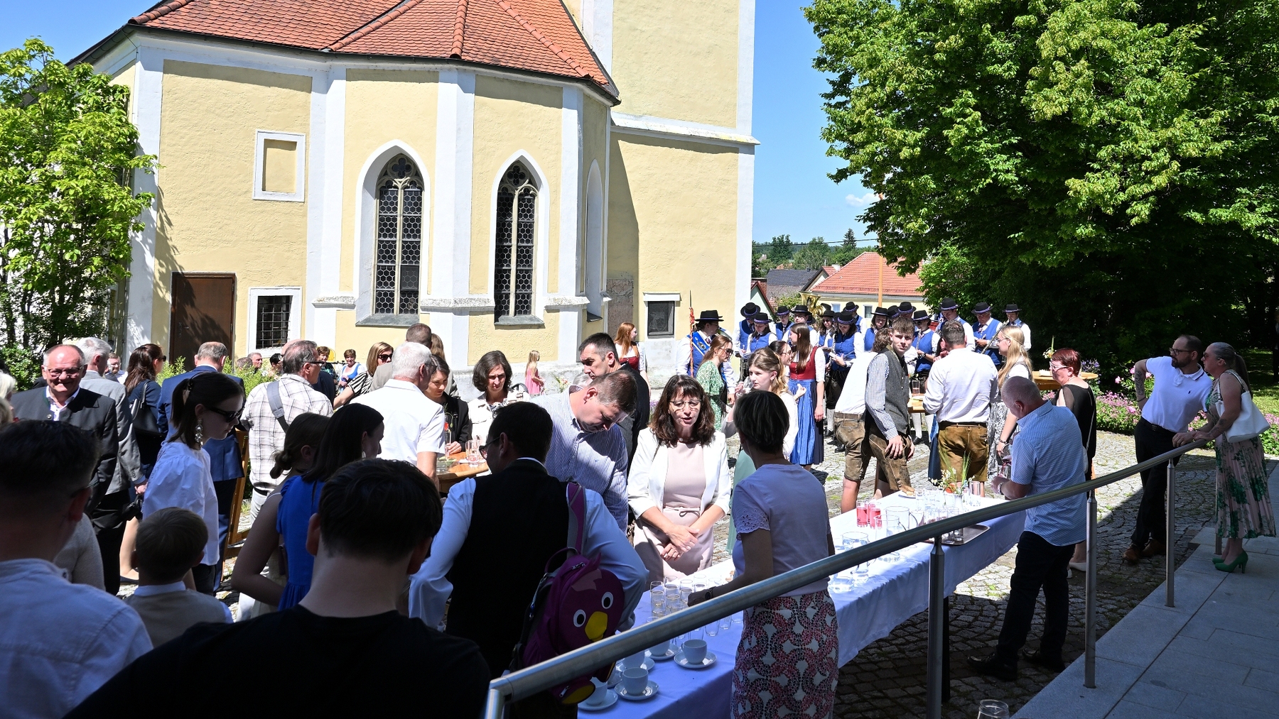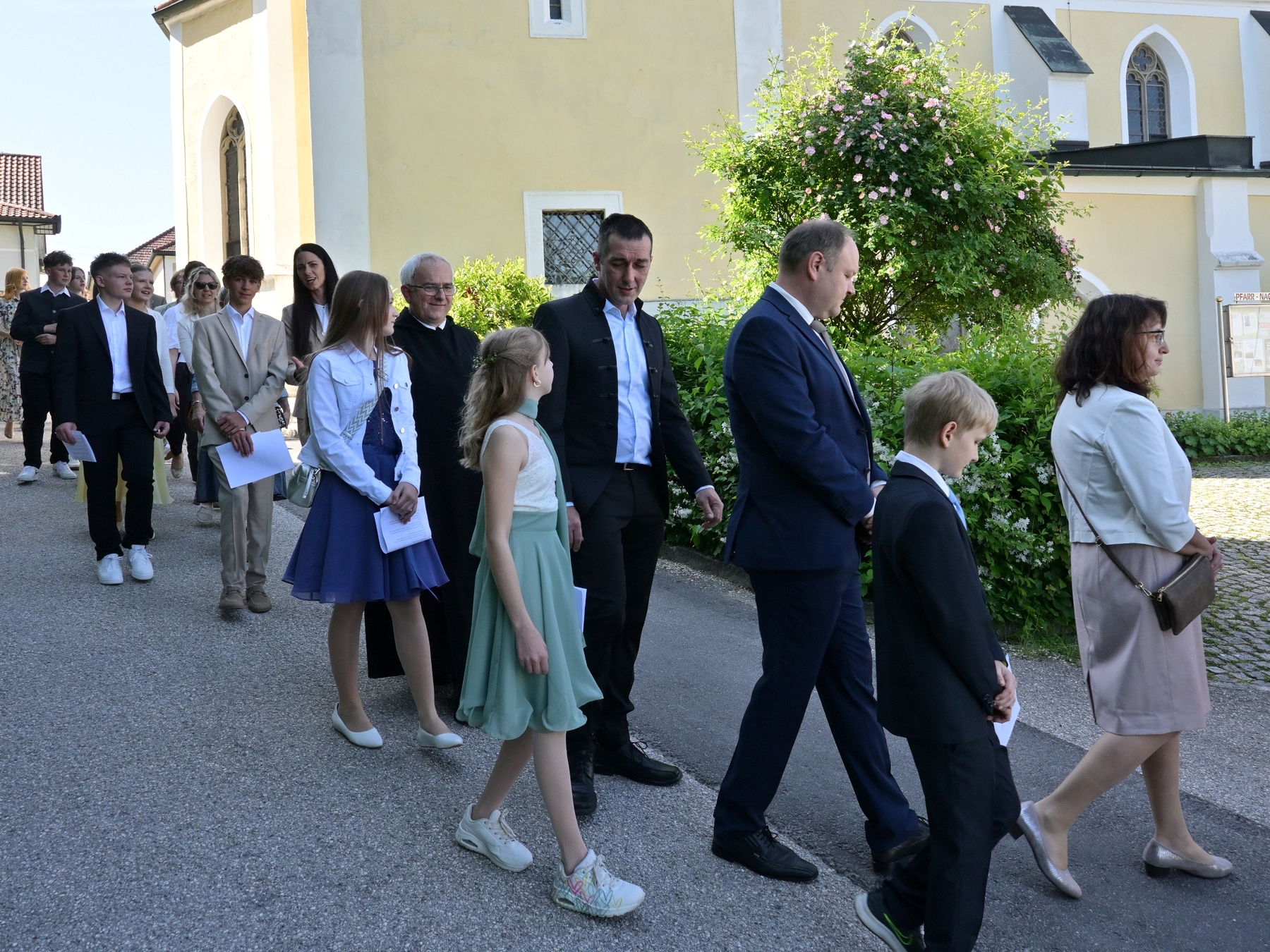 Bei strahlendem Wetter und den Klängen des Musikvereins Prambachkirchen fanden sich die Firmlinge mit ihren Patinnen / Paten und Verwandten auf dem Pfarrplatz ein um sich für das Fest der Firmung aufzustellen.