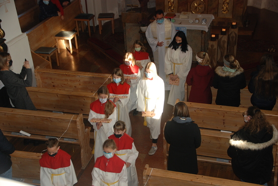 Mit dem Umlegen des roten Kragens durch Pfarrer Thomas wurden sie formell in das Ministrantenteam aufgenommen. Sie bekamen ein geweihtes Kreuz und ein kleines Geschenk überreicht.