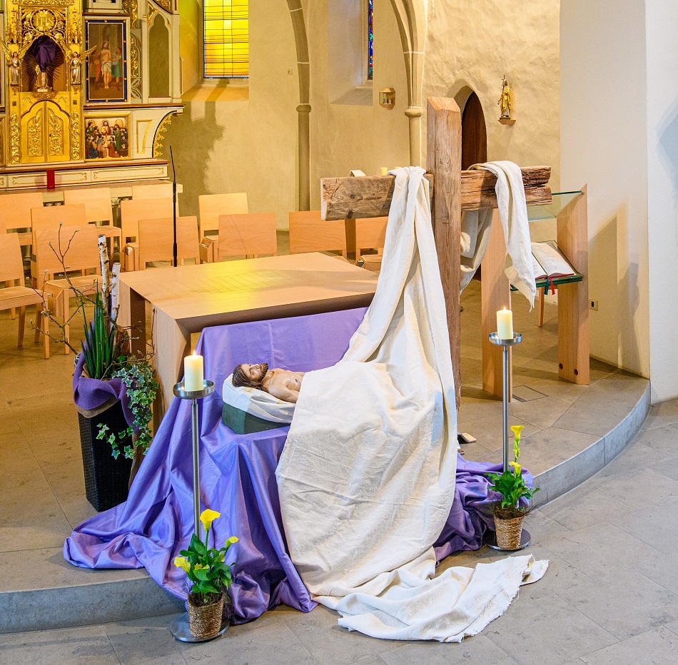 Aus altem Holz, das bei der Renovierung aus dem Kirchturm entfernt wurde, baute Klaus Leitner ein Kreuz, das am Karfreitag in der Liturgie zusammengebaut wurde.