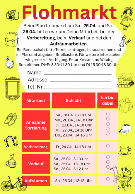 Die Pfarrgemeinde Pucking lädt zum großen Pfarrflohmarkt am 25. April: 8-17 Uhr und am 26. April: 8-12 Uhr ein.