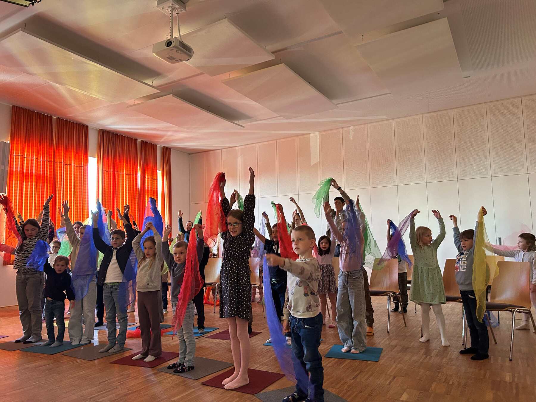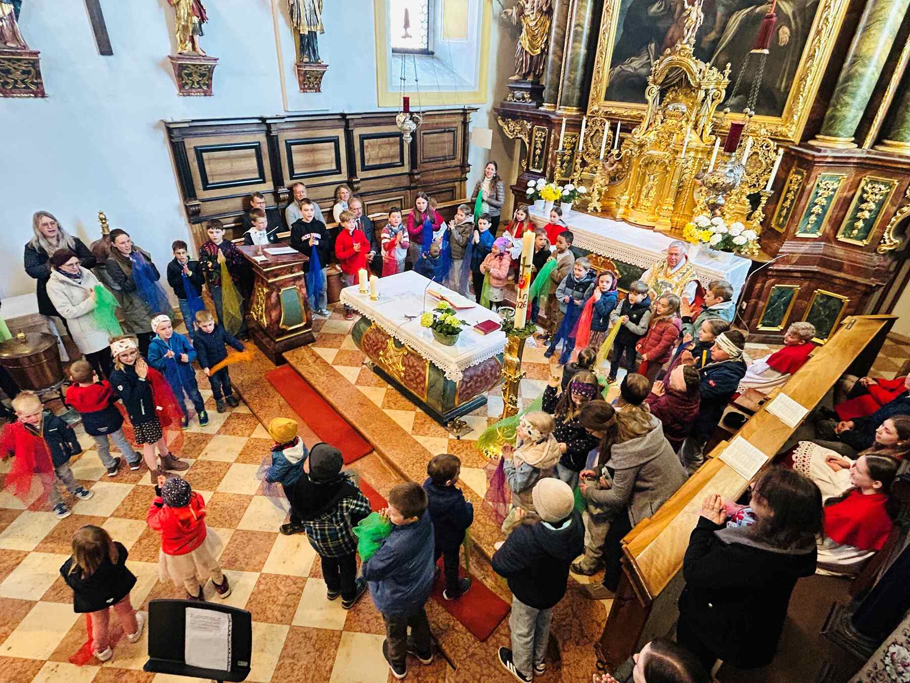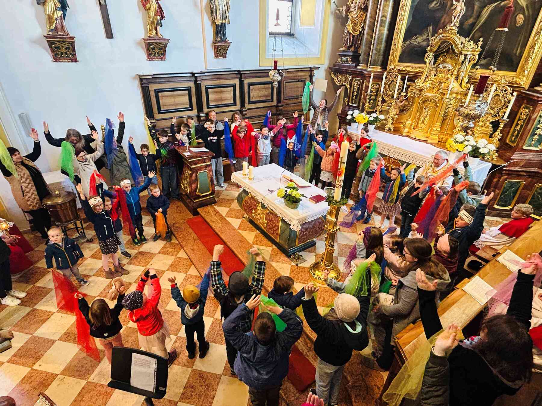 Mit Begeisterung sangen und tanzten die Kinder einen Ostertanz, den sie zum Abschluss im Altarraum präsentierten.