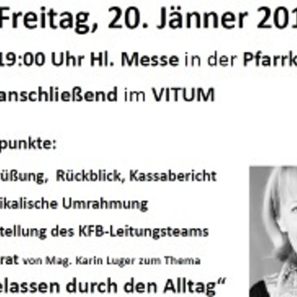 Am Freitag, 20. Jänner 2017 findet die Jahreshauptversammlung der Kath. Frauenbewegung statt. Um 19:00 Uhr findet eine Hl. Messe in der Pfarrkirche im Gedenken an die verstorbenen Mitglieder statt. Anschließend findet im Vitum die Jahreshauptversammlung mit dem Impulsreferat „Gelassen durch den Alltag“ mit der Referentin Mag. Karin Luger statt. Alle interessierten Frauen sind recht herzlich eingeladen.