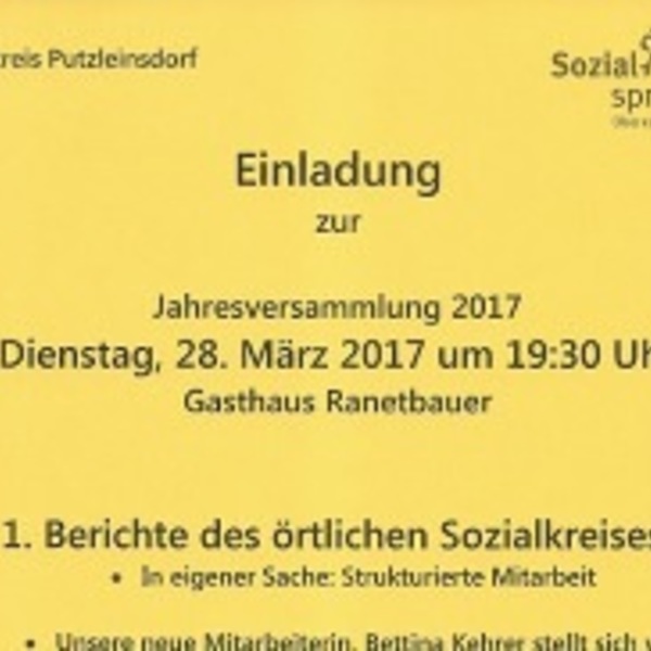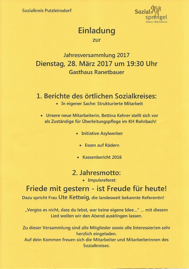 Der Sozialkreis Putzleinsdorf lädt zur Jahresversammlung ein am Dienstag, 28.03.2017 um 19:30 Uhr im Gasthaus Ranetbauer