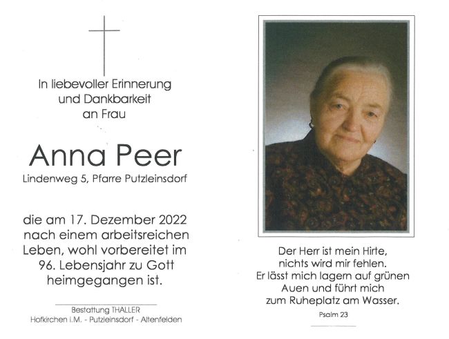 17.12.2022: Anna Peer, Lindenweg 5, 96. Lj