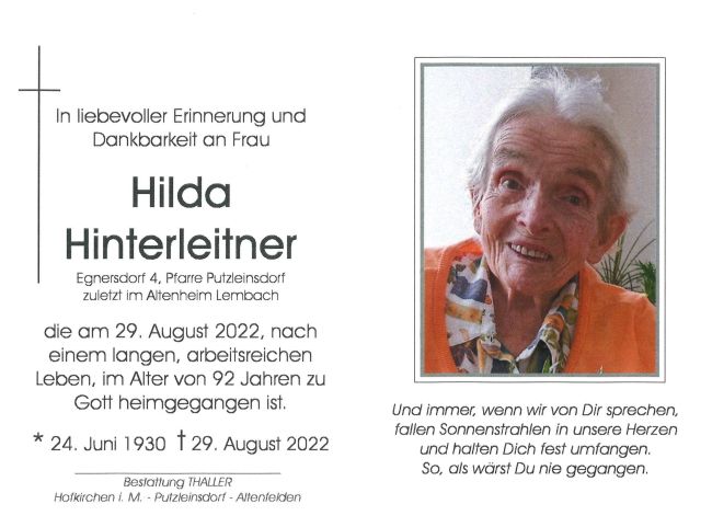 29.08.2022: Hildegard Hinterleitner, Egnersdorf 4, (zul. AH Lembach), 93. Lj