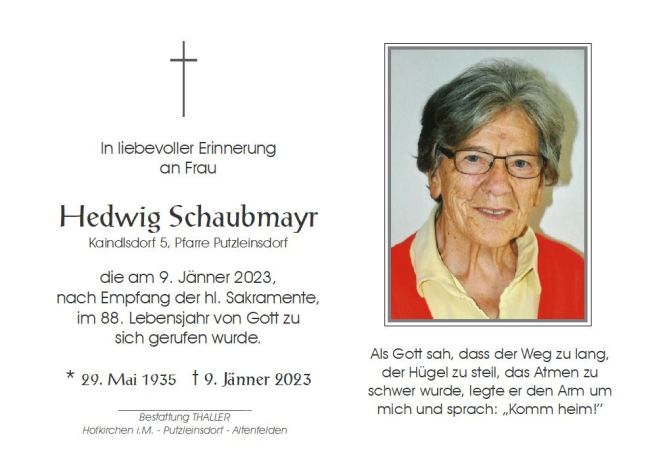 09.01.2023, Hedwig Schaubmayr, Kaindlsdorf 5 (Markt 1), 88. Lj.