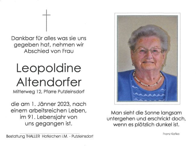 01.01.2023: Leopoldine Altendorfer, Mitterweg 12, 91. Lj