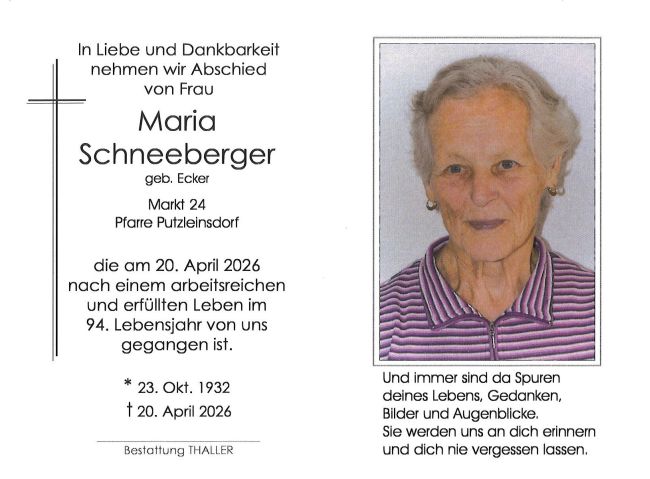 20.04.2026: Maria Schneeberger, Markt 24, 94. Lj.