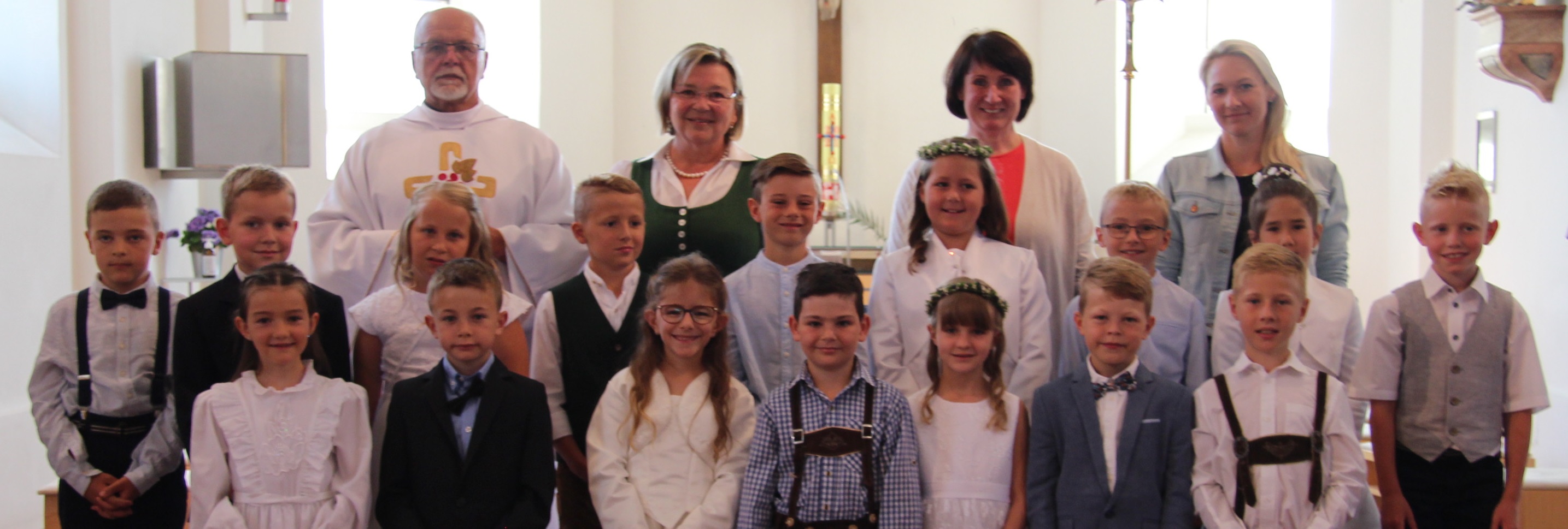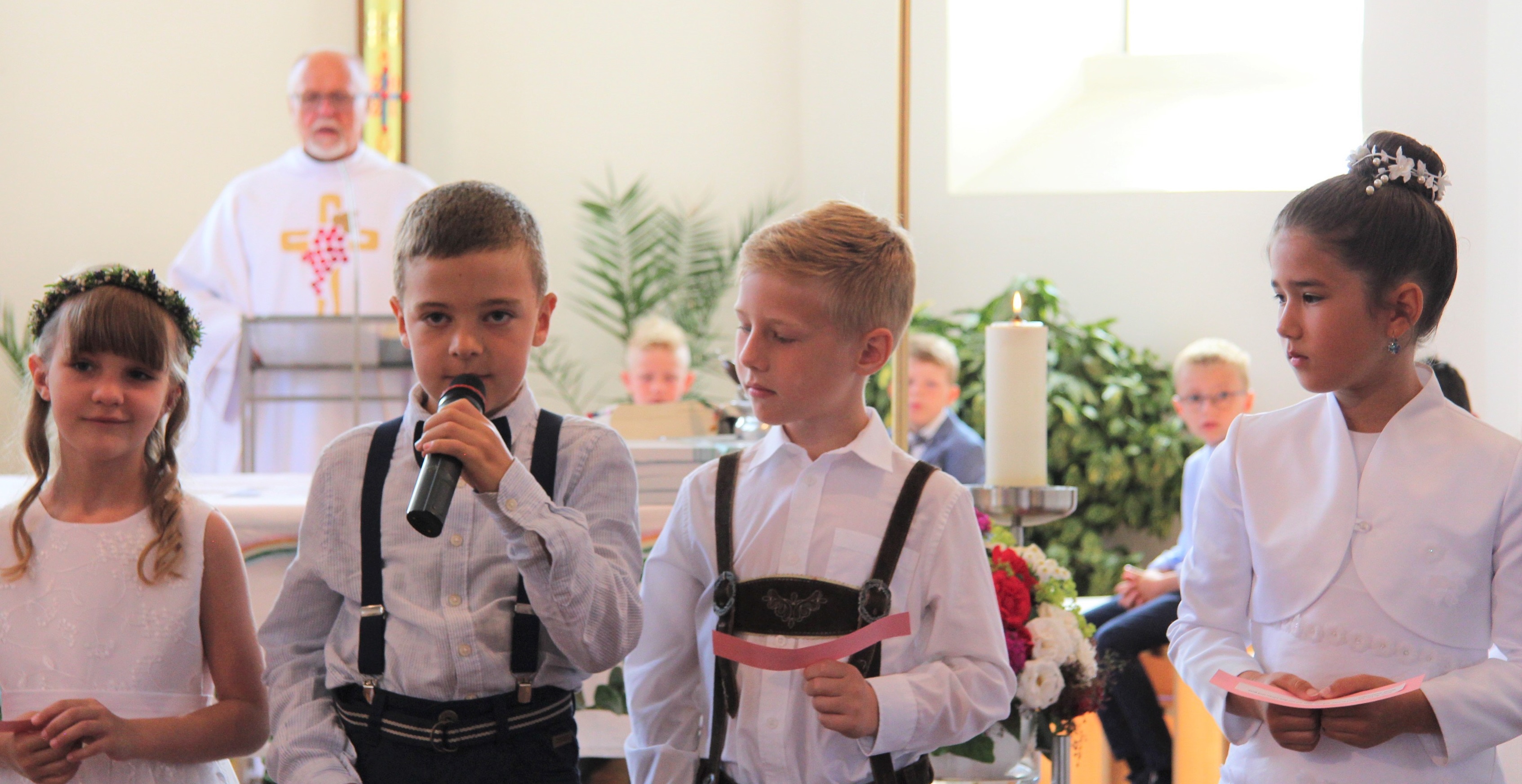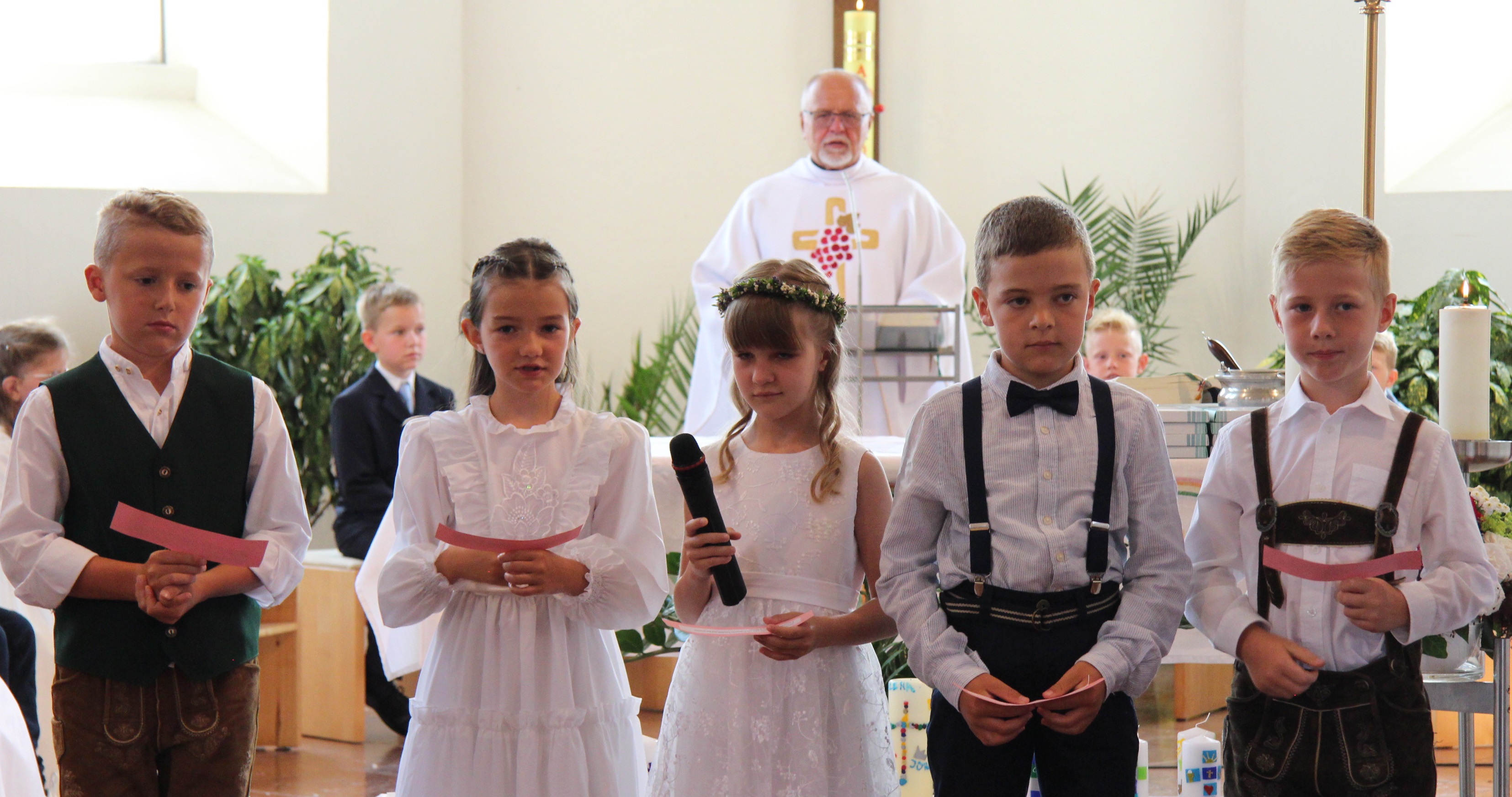 Am 26. Juni feierten 16 Kinder die Hl. Erstkommunion. Die Kinder zogen mit ihren Eltern in die Kirche ein. Im feierlichen Gottesdienst mit Pfarrer Thaddäus, erlebten die Kinder und Eltern ein schönes Fest. . Bei der anschließenden Agape und bei strahlendem Sonnenschein feierten alle gemeinsam auf dem Kirchplatz weiter. Ein herzliches Dankeschön an das Erstkommunionteam und an alle, die zu diesem Fest beigetragen haben.