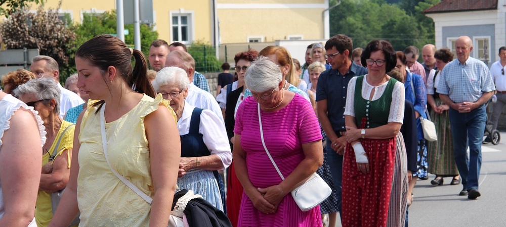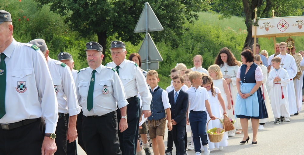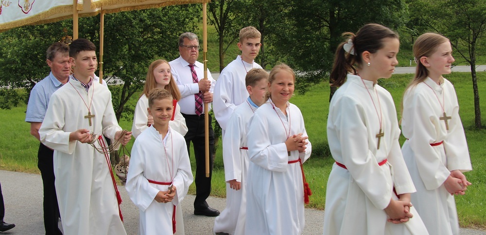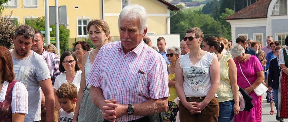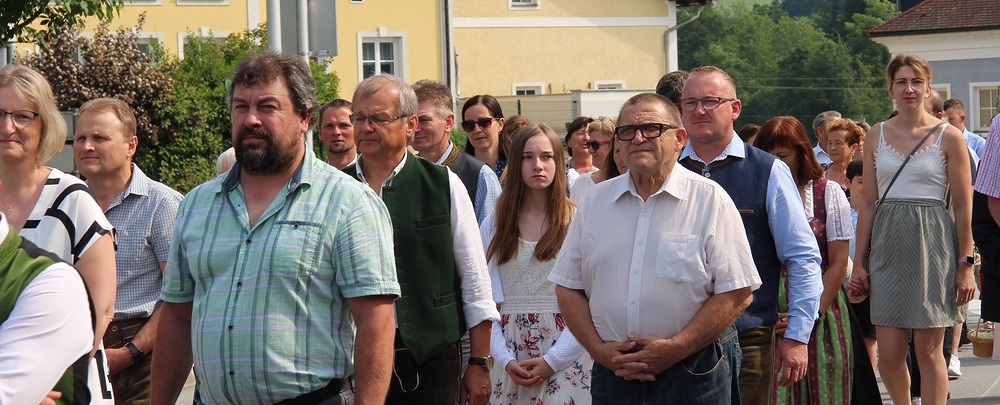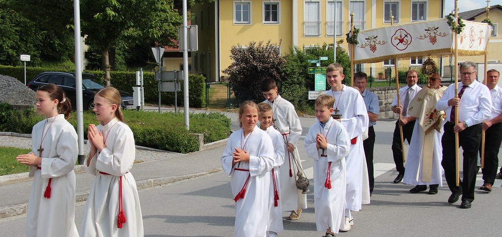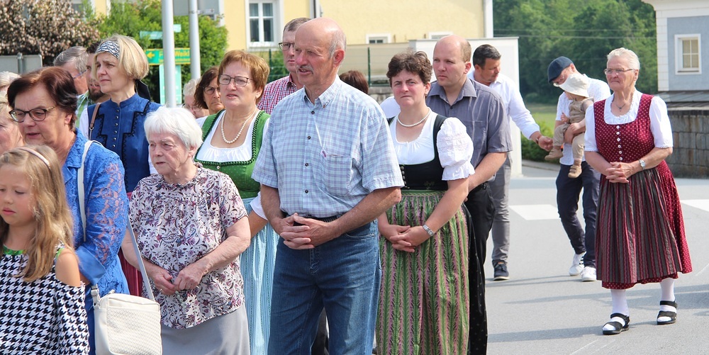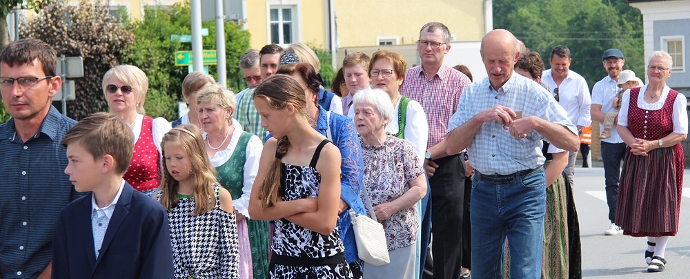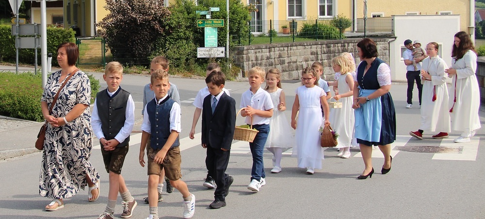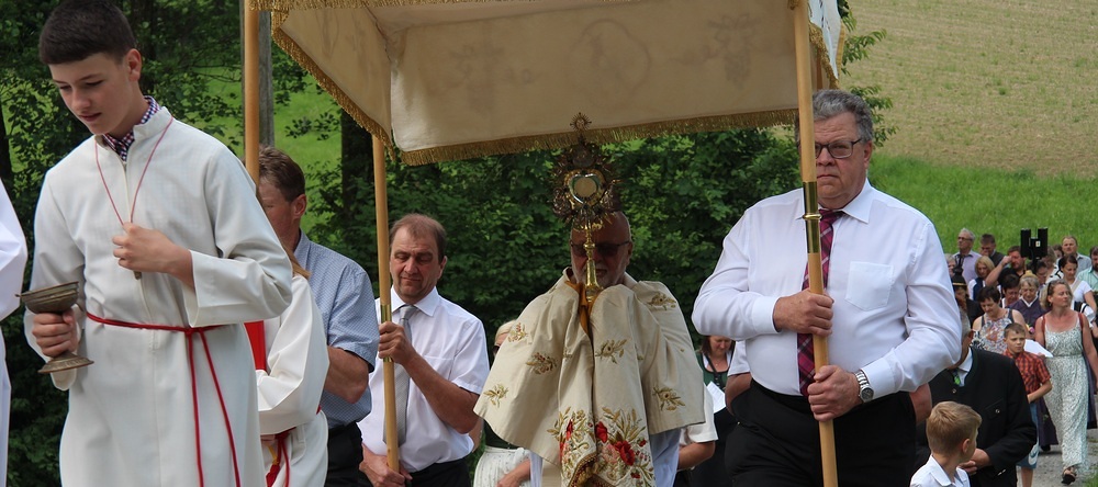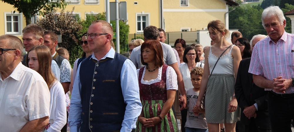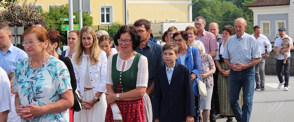 Diese Fronleichnamsprozession die von Pfarrer Thaddäus Kret gehalten wurde, der zuvor auch in der Pfarrkirche die Frühmesse hielt wurde zu einem würdigen Fest des Altarssakramentes, die Himmelträger, begleitet von Ministrantinnen und Ministranten, Musikerinnen und Musikern, Erstkommunion-Kindern, Trachten und zahlreichen Menschen.Die Goldhaubenfrauen waren ebenso dabei wie andere pfarrliche Organisationen und der Kirchenchor. Die Musikkapelle hatte die Prozession musikalisch mitgestaltet.