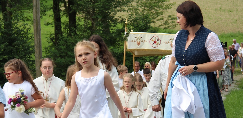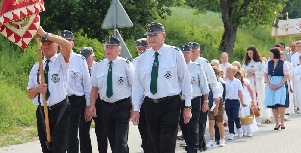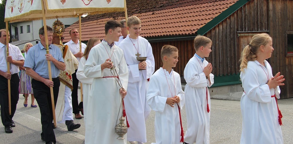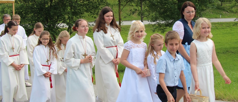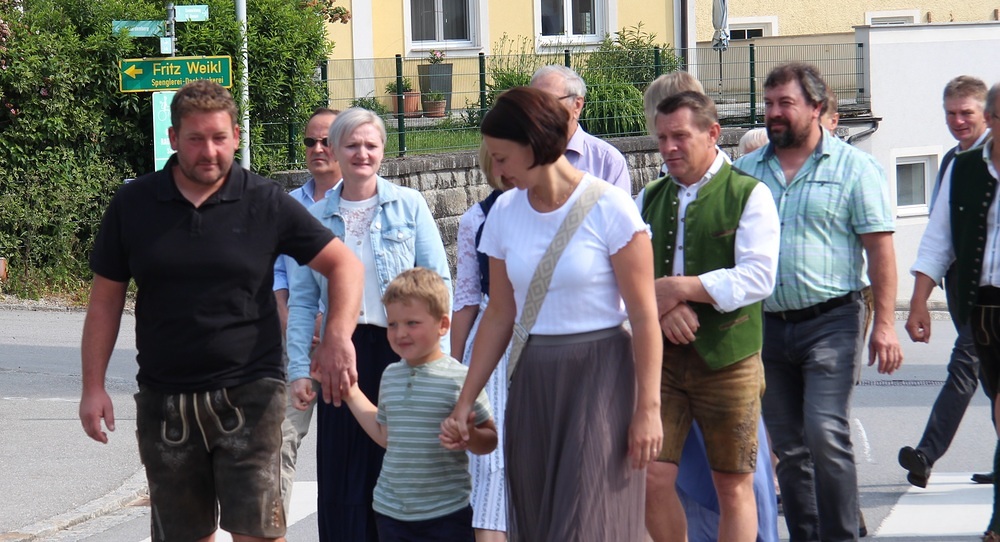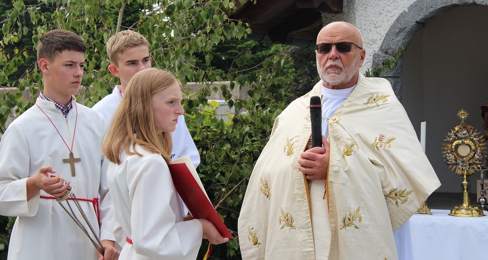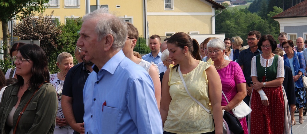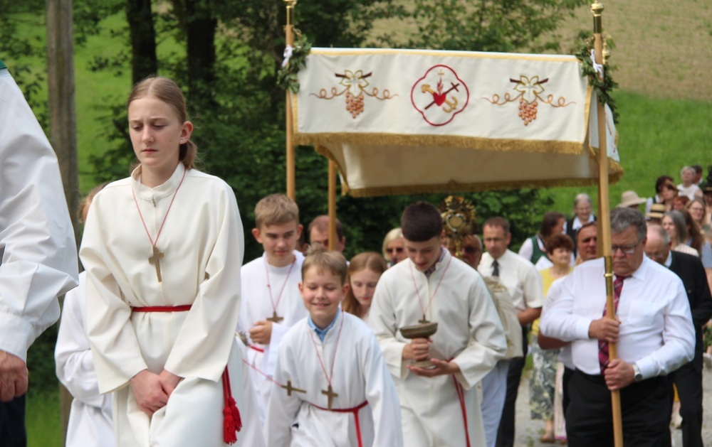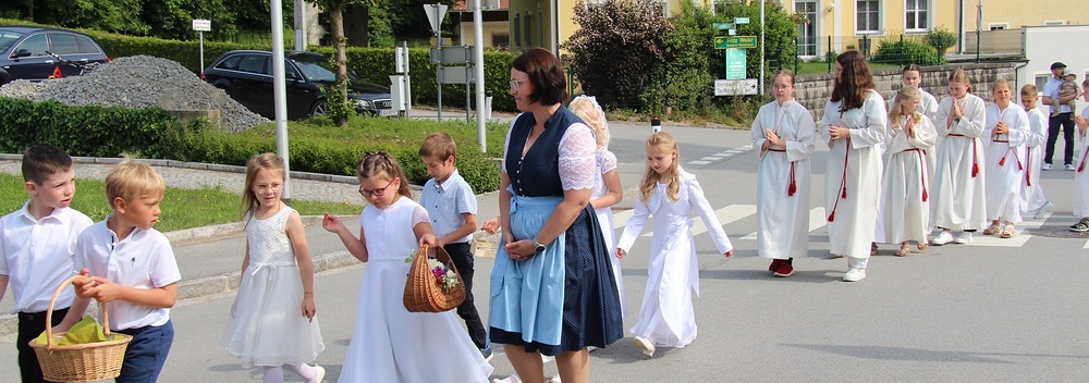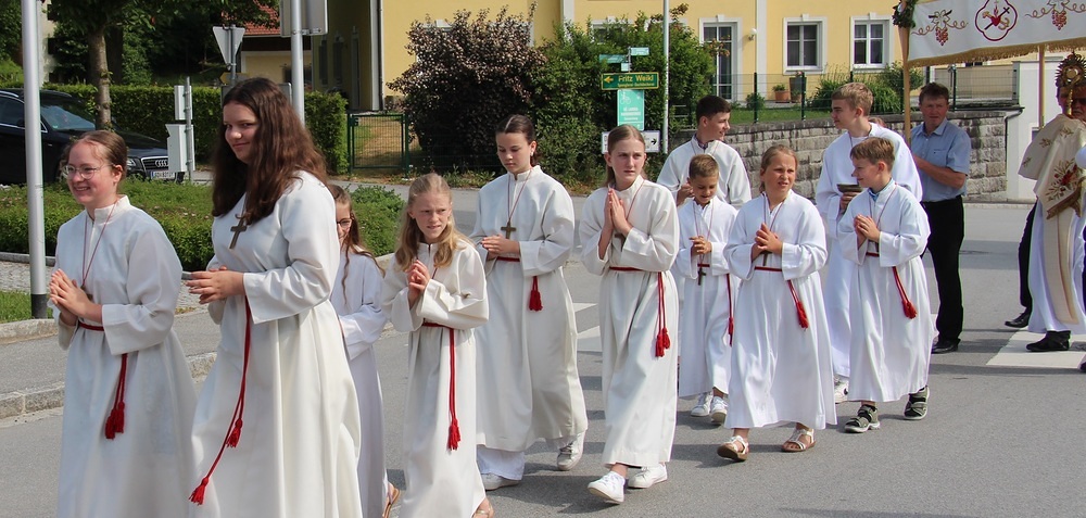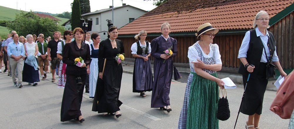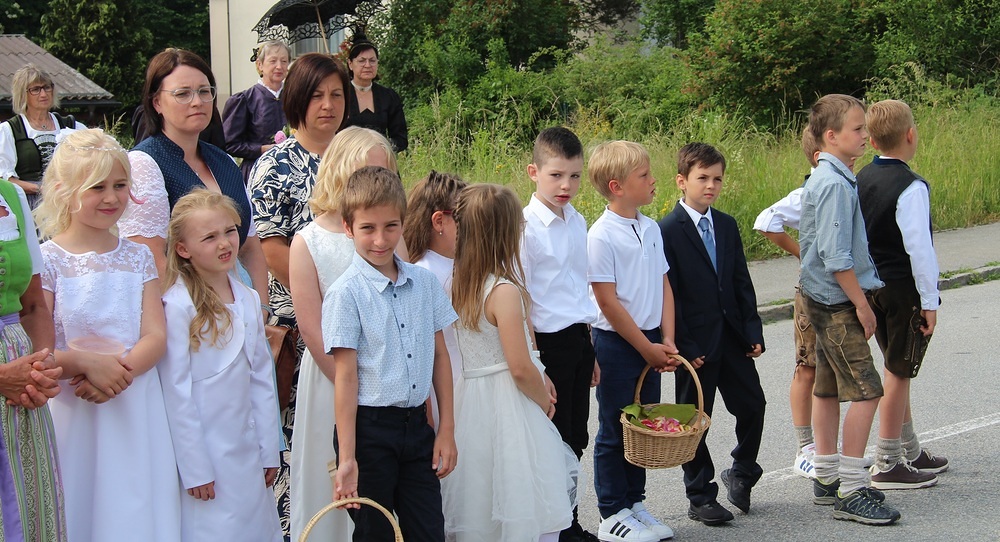 Diese Fronleichnamsprozession die von Pfarrer Thaddäus Kret gehalten wurde, der zuvor auch in der Pfarrkirche die Frühmesse hielt wurde zu einem würdigen Fest des Altarssakramentes, die Himmelträger, begleitet von Ministrantinnen und Ministranten, Musikerinnen und Musikern, Erstkommunion-Kindern, Trachten und zahlreichen Menschen.Die Goldhaubenfrauen waren ebenso dabei wie andere pfarrliche Organisationen und der Kirchenchor. Die Musikkapelle hatte die Prozession musikalisch mitgestaltet.