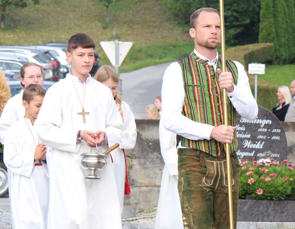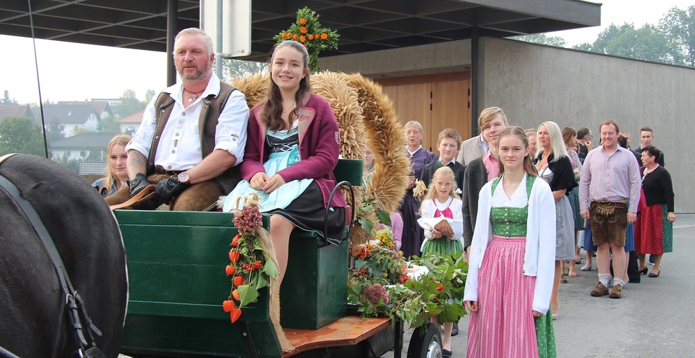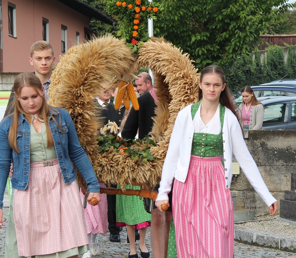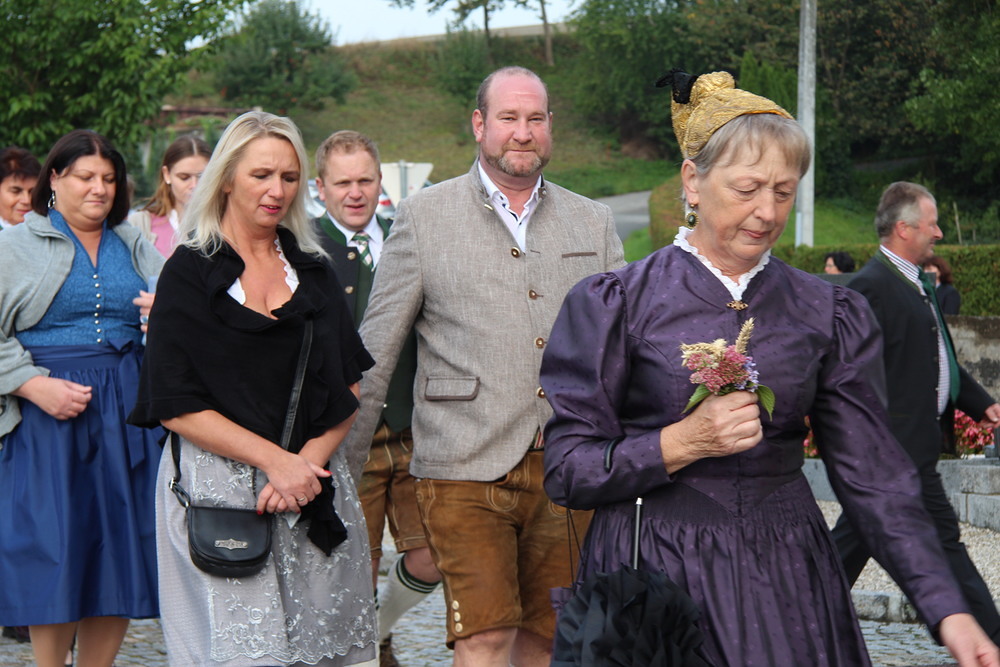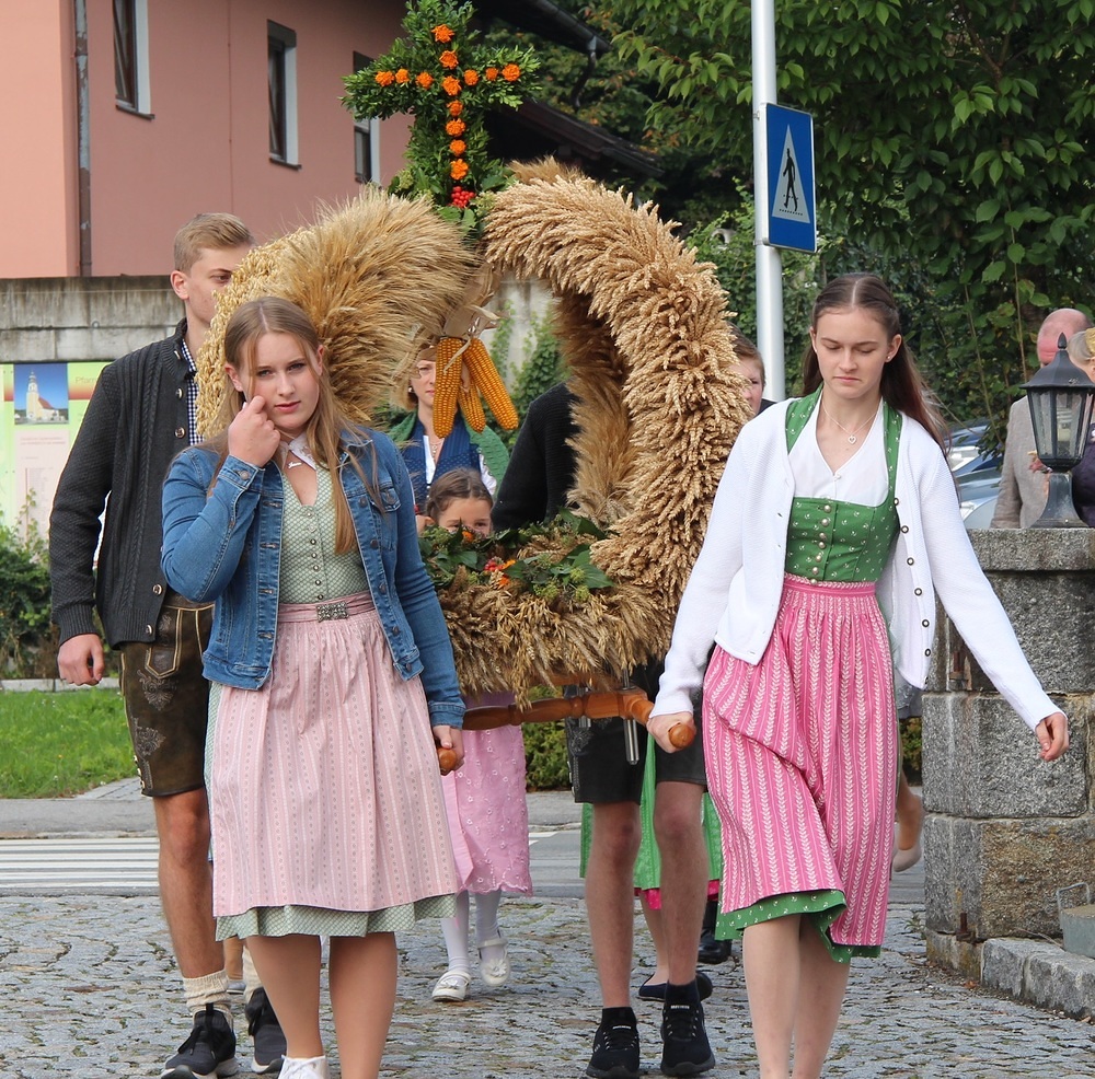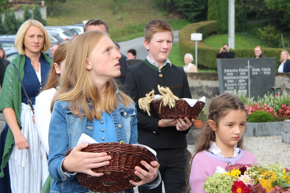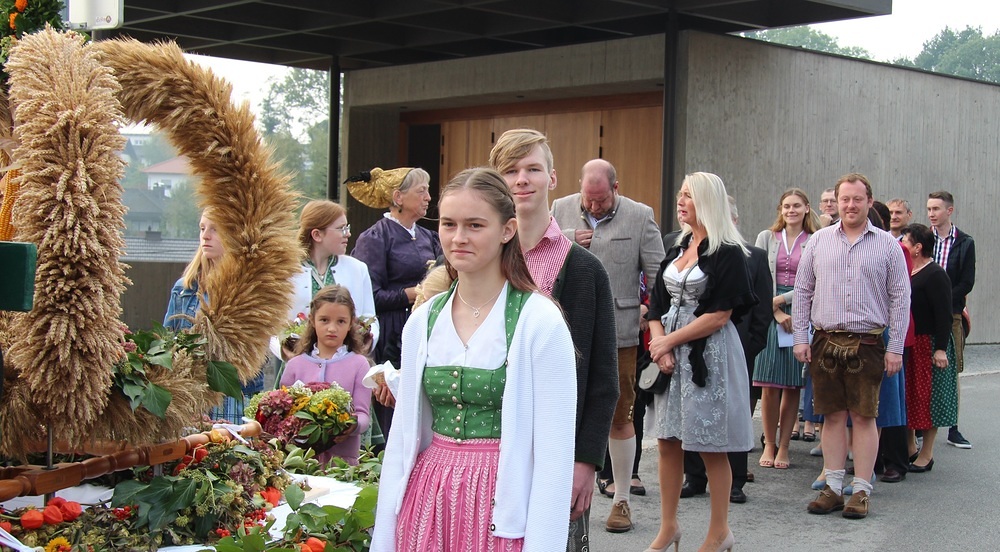 Kunstvoll zur Erntekrone gebundenes Getreide, Obst, Gemüse und Blumen werden in einer festlichen Prozession von der Ortschaften: Wienering, Edermaning und Eggenberg vom Kirchenplatz in die Kirche getragen. Der Duft der Früchte und die bunten Farben der Erntegaben stimmen uns dankbar.