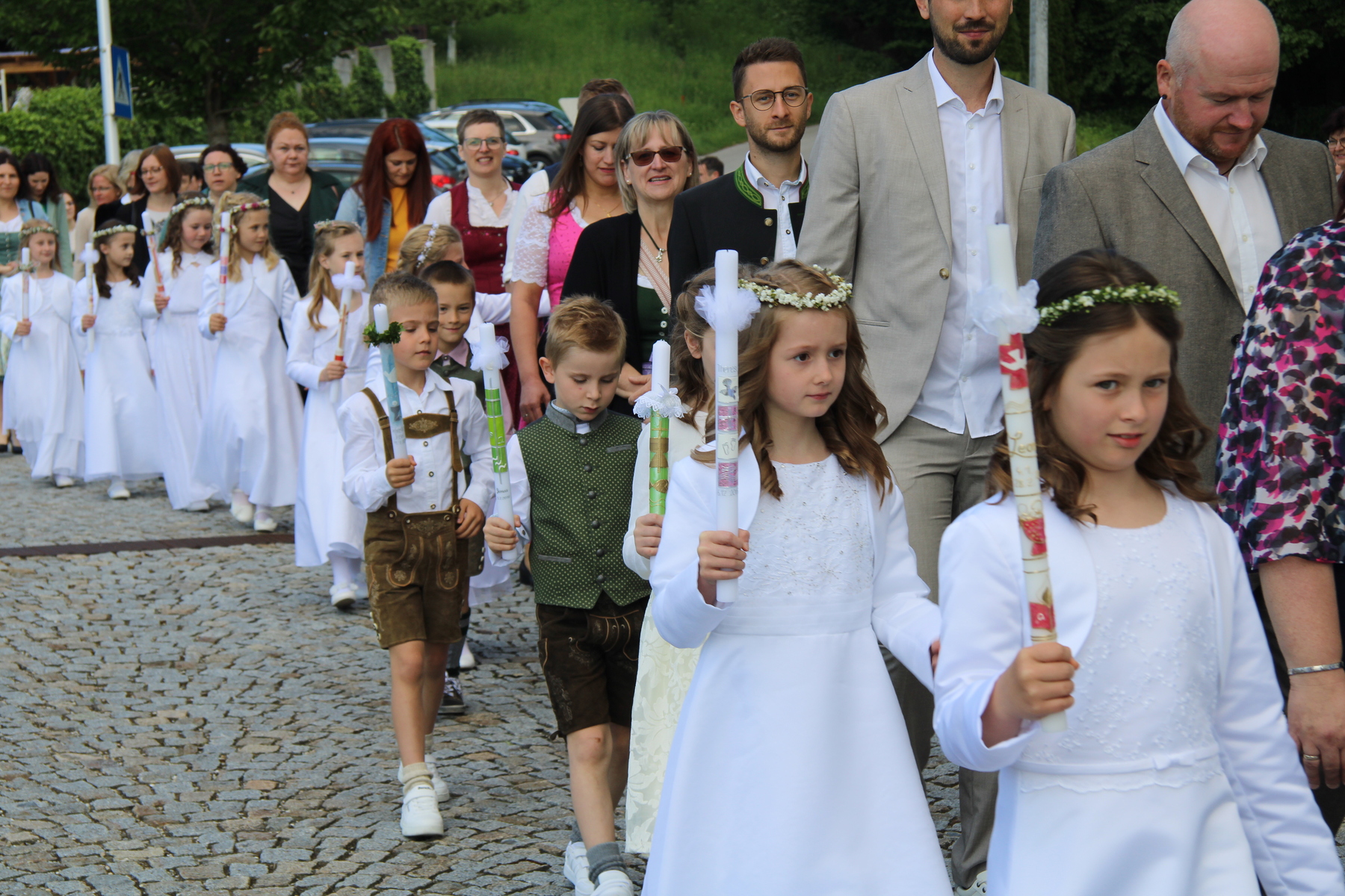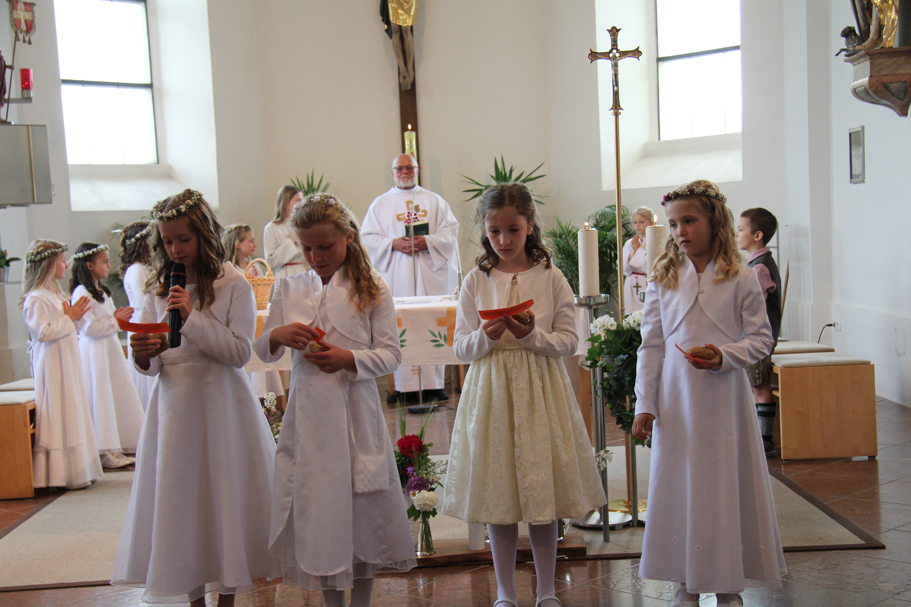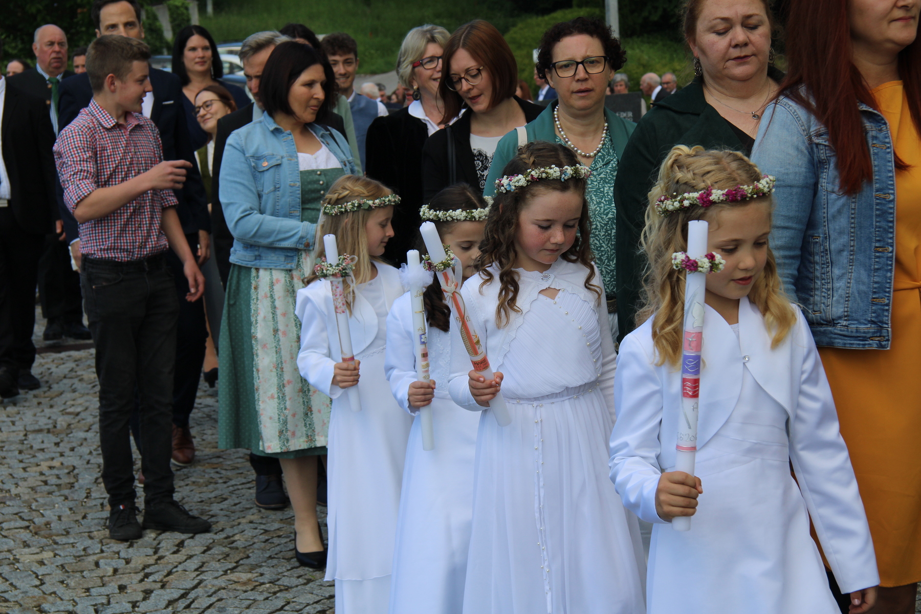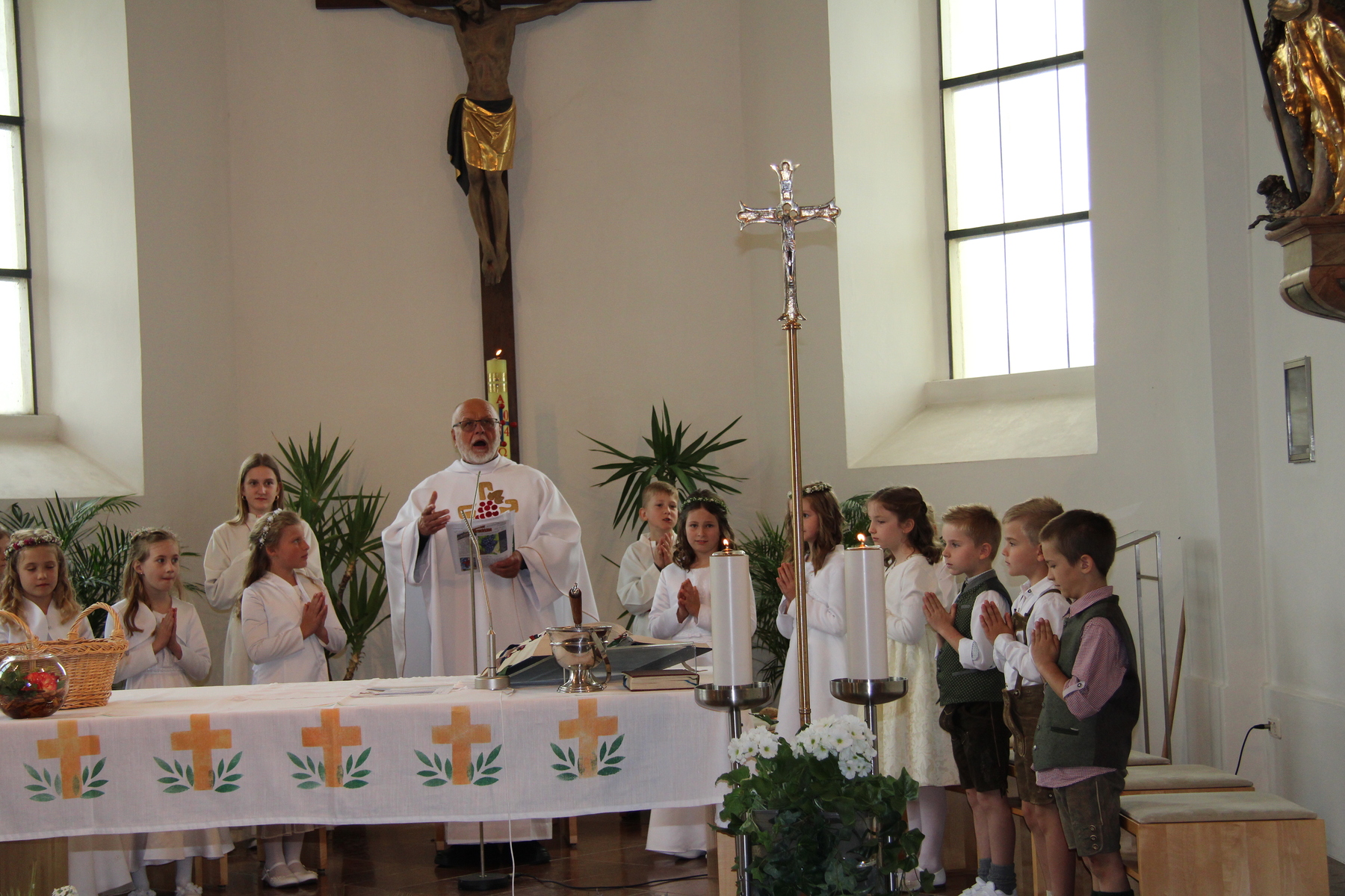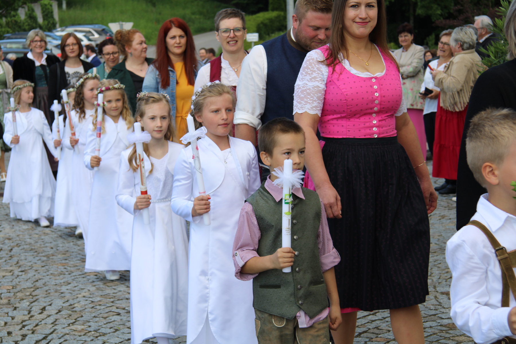 Insgesamt 12 Mädchen und Buben aus der Gemeinde Rainbach gingen am Christi Himmerfahrt zum ersten Mal an den Tisch des Herrn. Für die 12 Kinder aus Rainbach beginnt dieser Tag besonders früh.. Die Aufstellung aller Kinder fand ebenfalls traditionell vor der Schule statt. Hier trafen sich Kinder und Familien aus allen Orten, um dann ebenfalls mit schöner Blasmusik, Pfarrer Thaddäus ,und den Ministranten bei strahlendem Sonnenschein in die geschmückte und bis zum letzten Platz voll besuchte Kirche St. Peter einzuziehen. Der Festgottesdienst zur ersten heiligen Kommunion stand unter dem Motto „ Jesus ,unsere Lenensfreude“. In seiner Predigt ging Hauptzelebrant Pfarrer Thaddäus Kret darauf ein, dass natürlich jeder Mensch eingeladen ist, die Köstlichkeiten an Gottes Tisch zu genießen, Jesus lädt jeden ein an seinem Tisch zu sitzen. Diesen festen Platz bei Jesus wünschte Pfarrer thaddäus jedem Kommunionkind für die Zukunft. Für eine wunderschöne, musikalische Gestaltung des Festgottesdienstes sorgten Fam. Niedermaier mit Kinderchor.