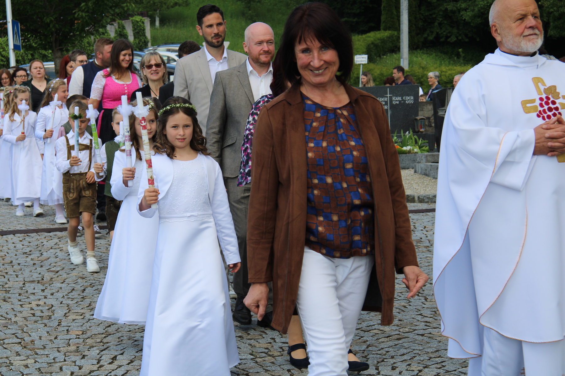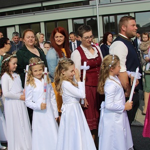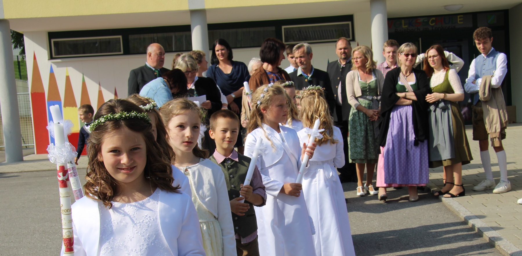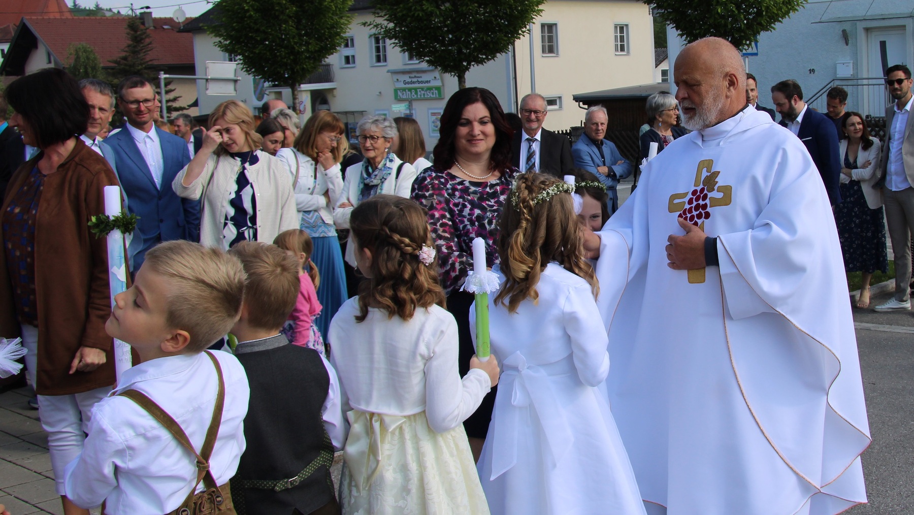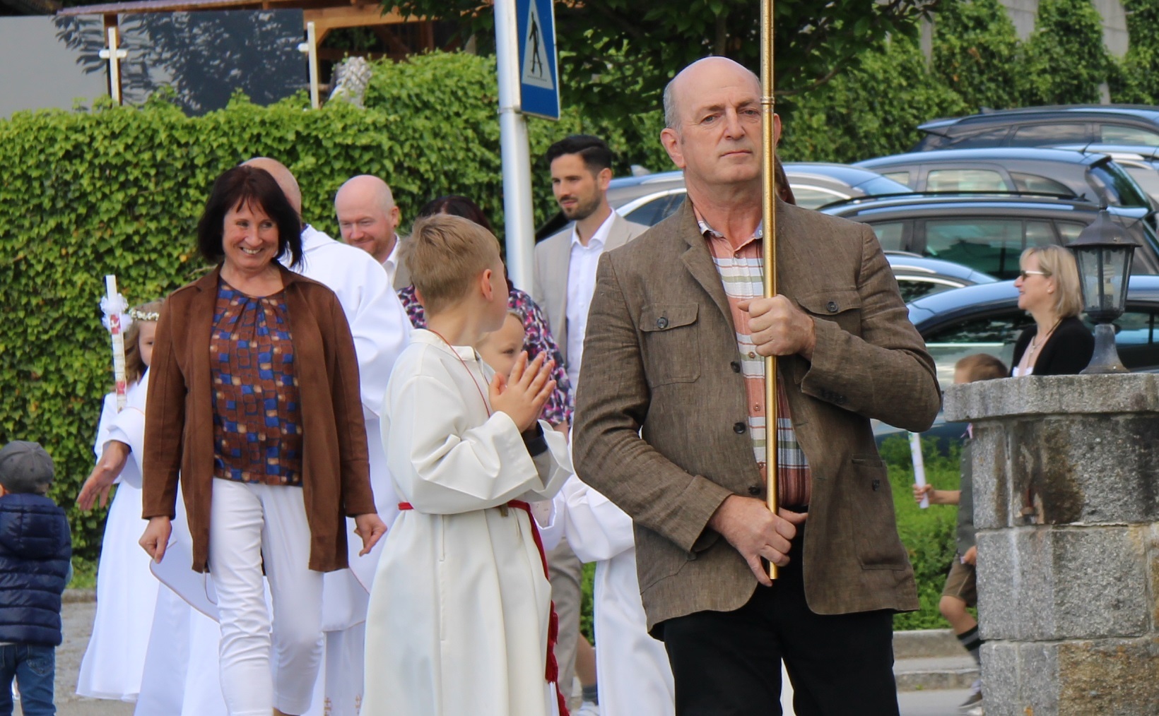 Insgesamt 12 Mädchen und Buben aus der Gemeinde Rainbach gingen am Christi Himmerfahrt zum ersten Mal an den Tisch des Herrn. Für die 12 Kinder aus Rainbach beginnt dieser Tag besonders früh.. Die Aufstellung aller Kinder fand ebenfalls traditionell vor der Schule statt. Hier trafen sich Kinder und Familien aus allen Orten, um dann ebenfalls mit schöner Blasmusik, Pfarrer Thaddäus ,und den Ministranten bei strahlendem Sonnenschein in die geschmückte und bis zum letzten Platz voll besuchte Kirche St. Peter einzuziehen. Der Festgottesdienst zur ersten heiligen Kommunion stand unter dem Motto „ Jesus ,unsere Lenensfreude“. In seiner Predigt ging Hauptzelebrant Pfarrer Thaddäus Kret darauf ein, dass natürlich jeder Mensch eingeladen ist, die Köstlichkeiten an Gottes Tisch zu genießen, Jesus lädt jeden ein an seinem Tisch zu sitzen. Diesen festen Platz bei Jesus wünschte Pfarrer thaddäus jedem Kommunionkind für die Zukunft. Für eine wunderschöne, musikalische Gestaltung des Festgottesdienstes sorgten Fam. Niedermaier mit Kinderchor.