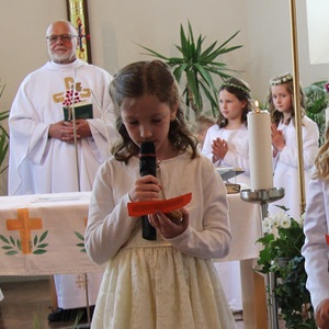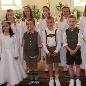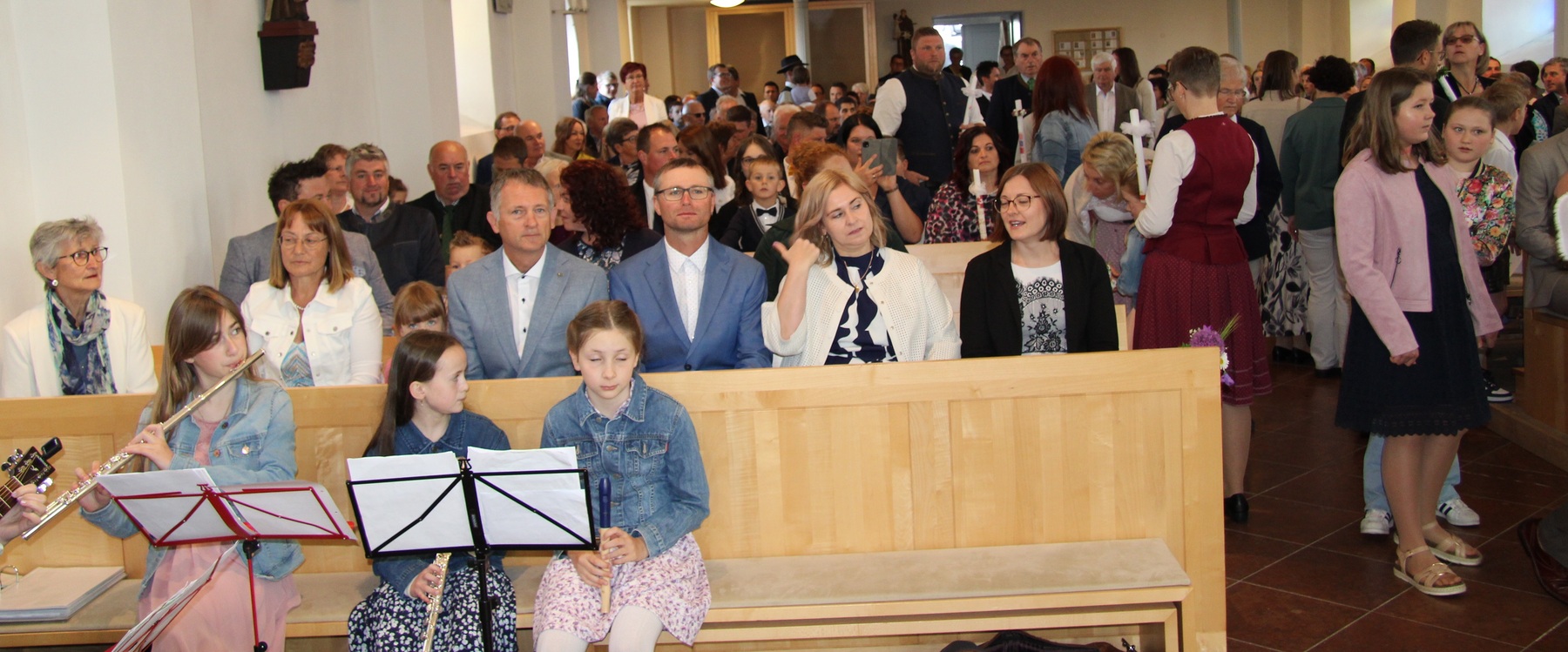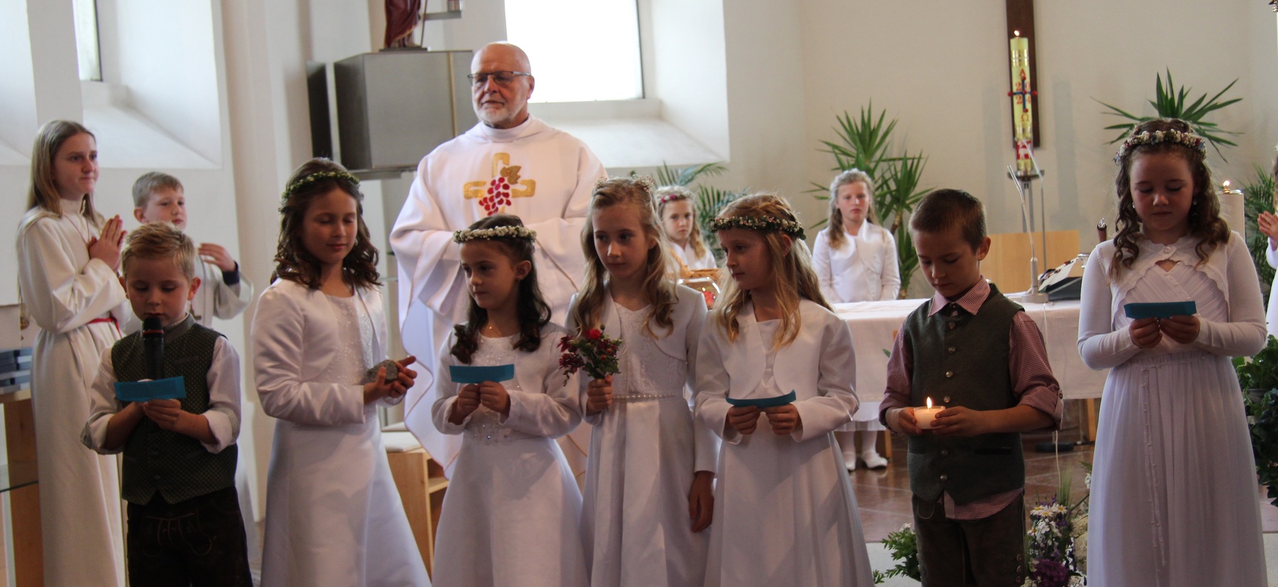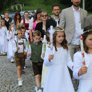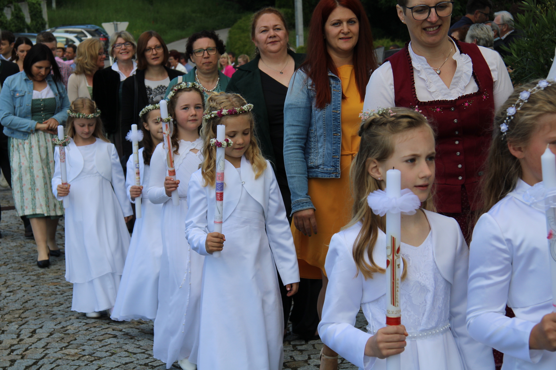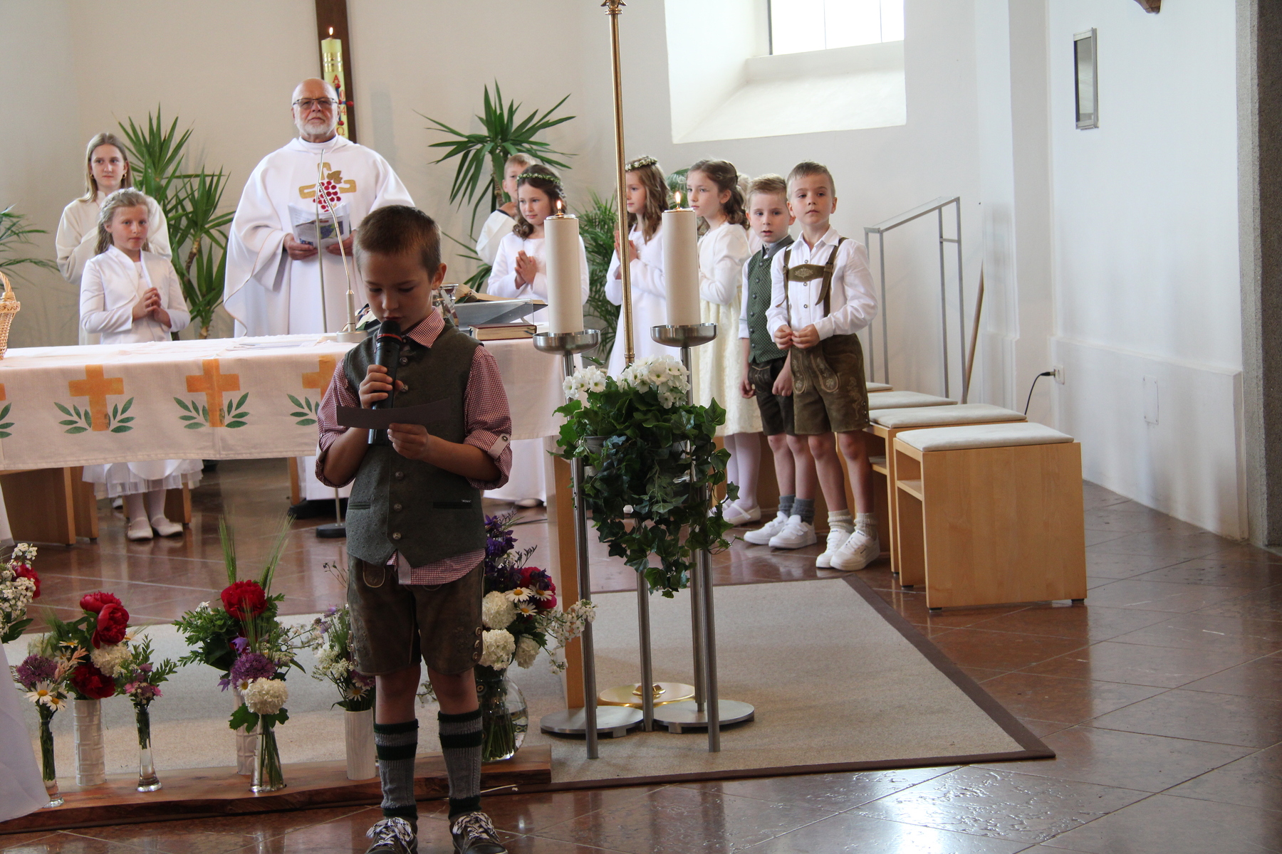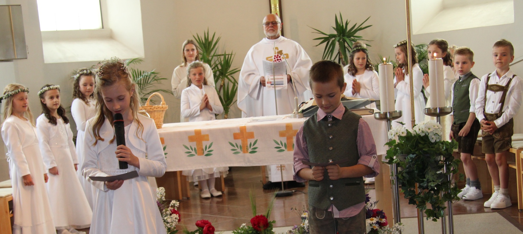 Insgesamt 12 Mädchen und Buben aus der Gemeinde Rainbach gingen am Christi Himmerfahrt zum ersten Mal an den Tisch des Herrn. Für die 12 Kinder aus Rainbach beginnt dieser Tag besonders früh.. Die Aufstellung aller Kinder fand ebenfalls traditionell vor der Schule statt. Hier trafen sich Kinder und Familien aus allen Orten, um dann ebenfalls mit schöner Blasmusik, Pfarrer Thaddäus ,und den Ministranten bei strahlendem Sonnenschein in die geschmückte und bis zum letzten Platz voll besuchte Kirche St. Peter einzuziehen. Der Festgottesdienst zur ersten heiligen Kommunion stand unter dem Motto „ Jesus ,unsere Lenensfreude“. In seiner Predigt ging Hauptzelebrant Pfarrer Thaddäus Kret darauf ein, dass natürlich jeder Mensch eingeladen ist, die Köstlichkeiten an Gottes Tisch zu genießen, Jesus lädt jeden ein an seinem Tisch zu sitzen. Diesen festen Platz bei Jesus wünschte Pfarrer thaddäus jedem Kommunionkind für die Zukunft. Für eine wunderschöne, musikalische Gestaltung des Festgottesdienstes sorgten Fam. Niedermaier mit Kinderchor.