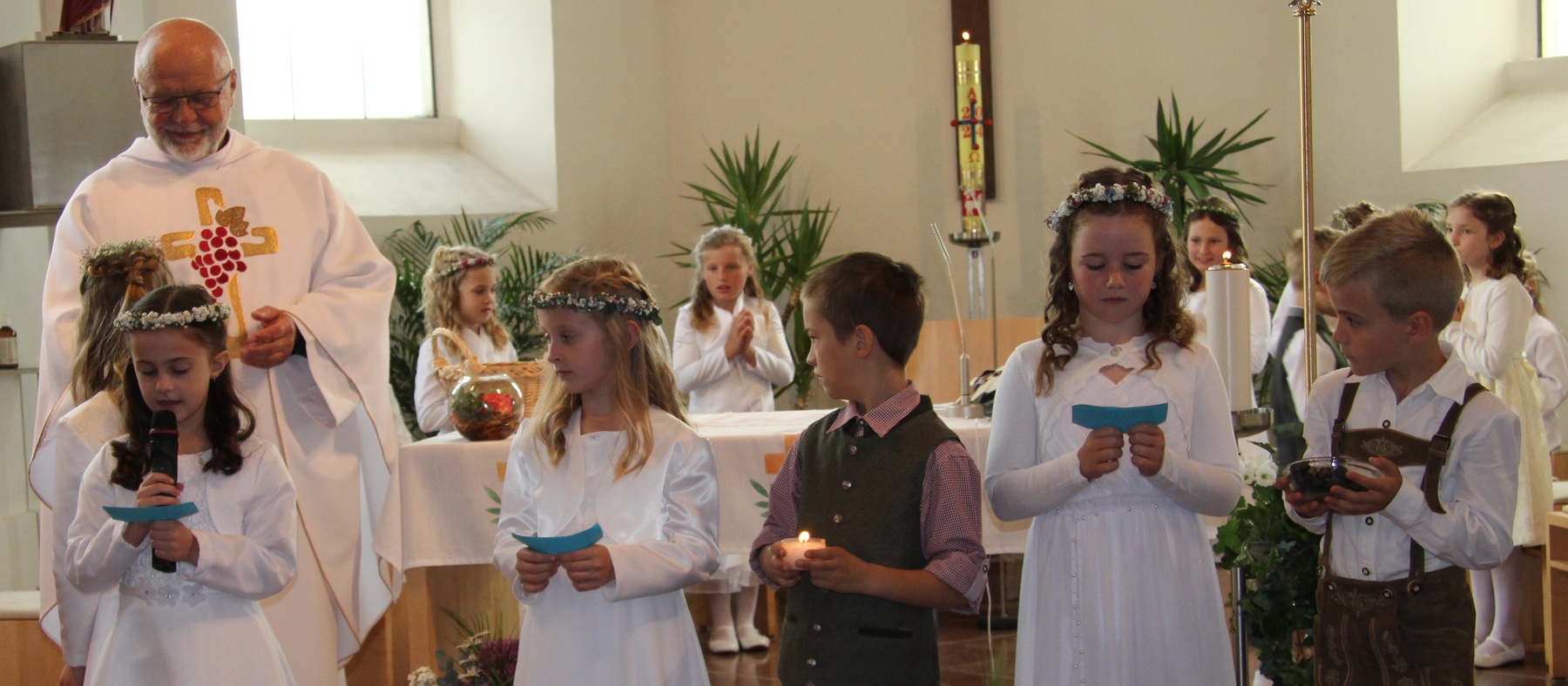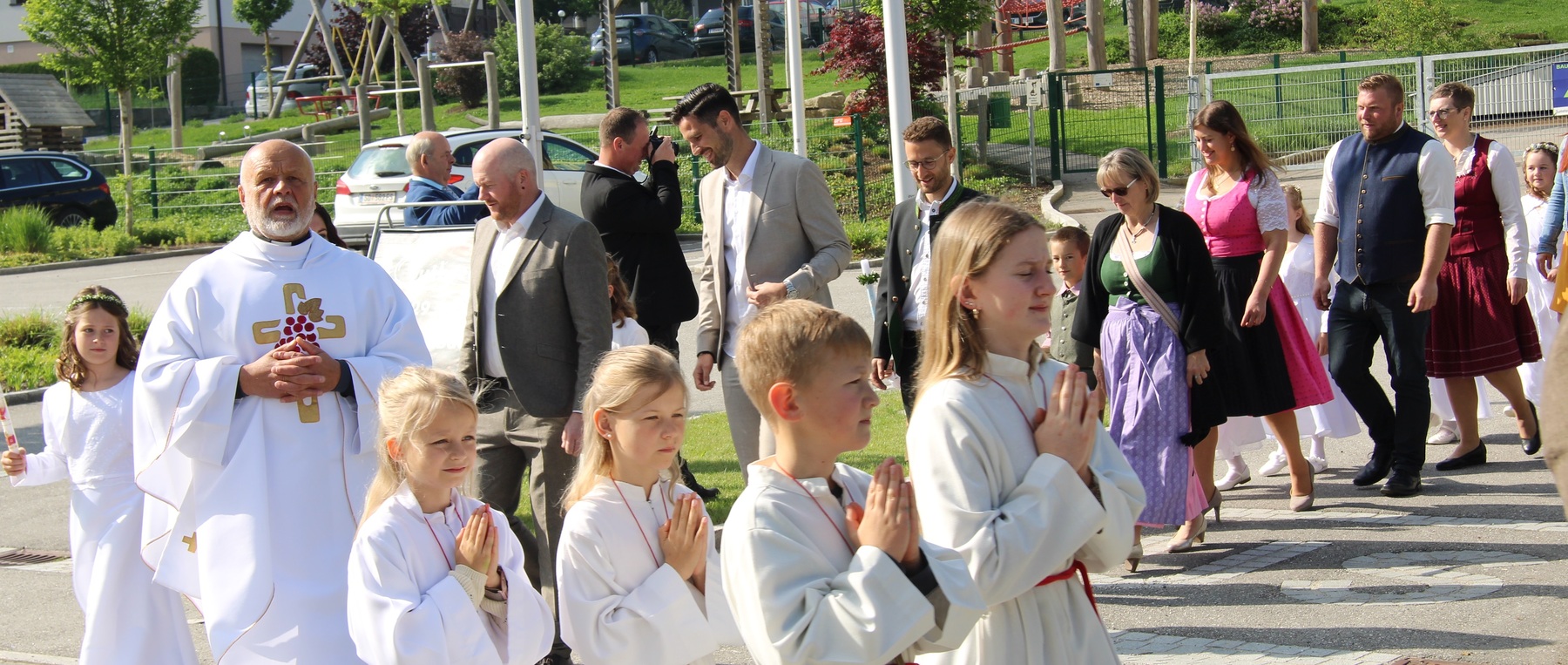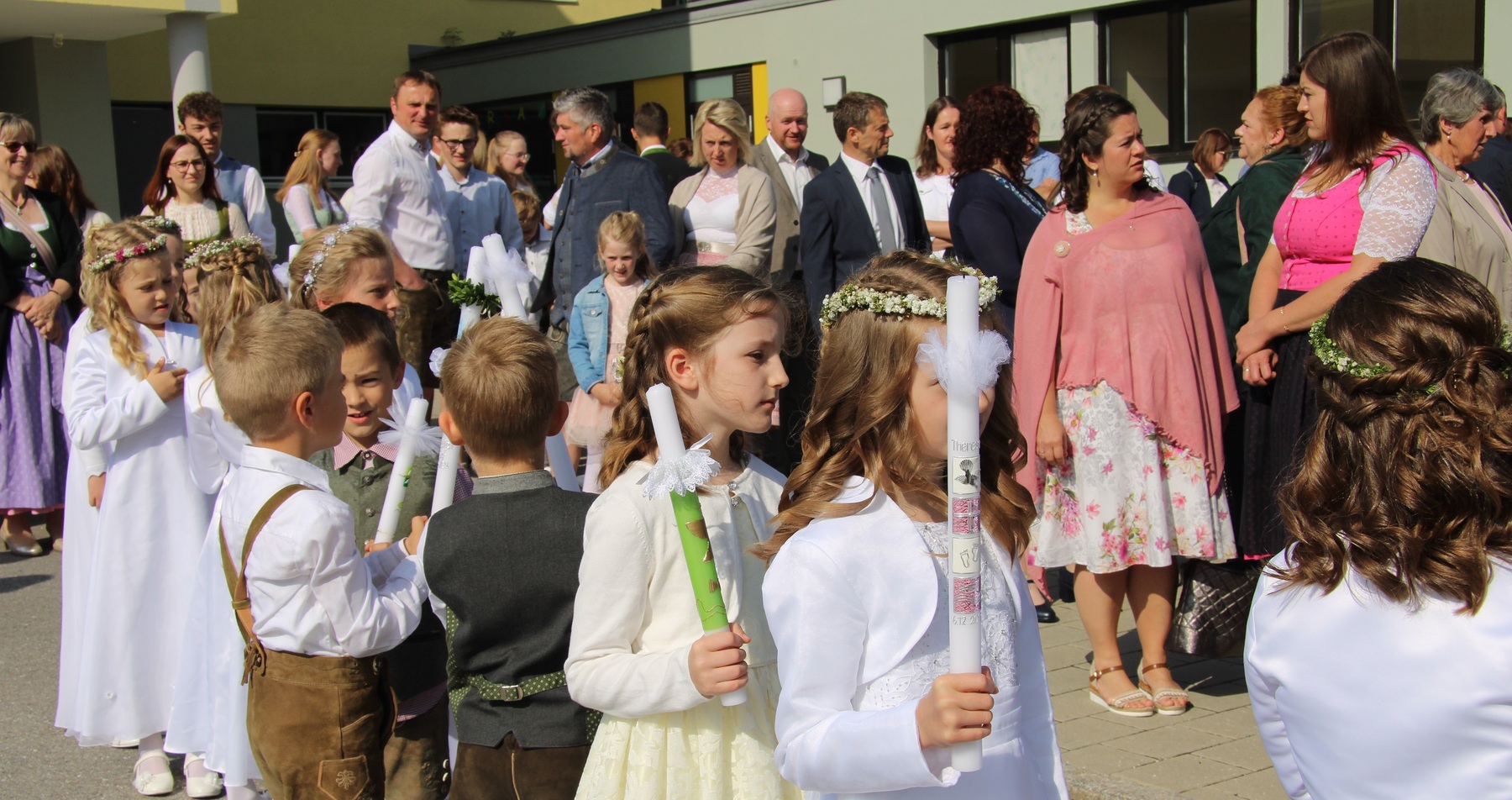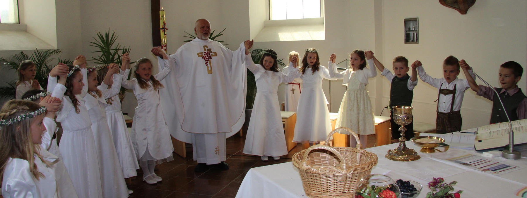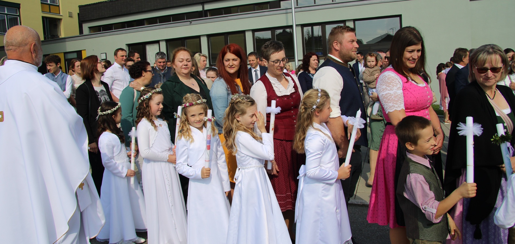 Insgesamt 12 Mädchen und Buben aus der Gemeinde Rainbach gingen am Christi Himmerfahrt zum ersten Mal an den Tisch des Herrn. Für die 12 Kinder aus Rainbach beginnt dieser Tag besonders früh.. Die Aufstellung aller Kinder fand ebenfalls traditionell vor der Schule statt. Hier trafen sich Kinder und Familien aus allen Orten, um dann ebenfalls mit schöner Blasmusik, Pfarrer Thaddäus ,und den Ministranten bei strahlendem Sonnenschein in die geschmückte und bis zum letzten Platz voll besuchte Kirche St. Peter einzuziehen. Der Festgottesdienst zur ersten heiligen Kommunion stand unter dem Motto „ Jesus ,unsere Lenensfreude“. In seiner Predigt ging Hauptzelebrant Pfarrer Thaddäus Kret darauf ein, dass natürlich jeder Mensch eingeladen ist, die Köstlichkeiten an Gottes Tisch zu genießen, Jesus lädt jeden ein an seinem Tisch zu sitzen. Diesen festen Platz bei Jesus wünschte Pfarrer thaddäus jedem Kommunionkind für die Zukunft. Für eine wunderschöne, musikalische Gestaltung des Festgottesdienstes sorgten Fam. Niedermaier mit Kinderchor.