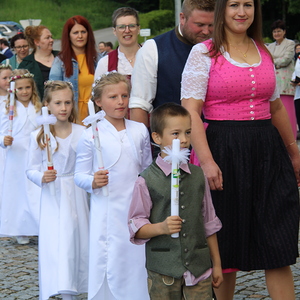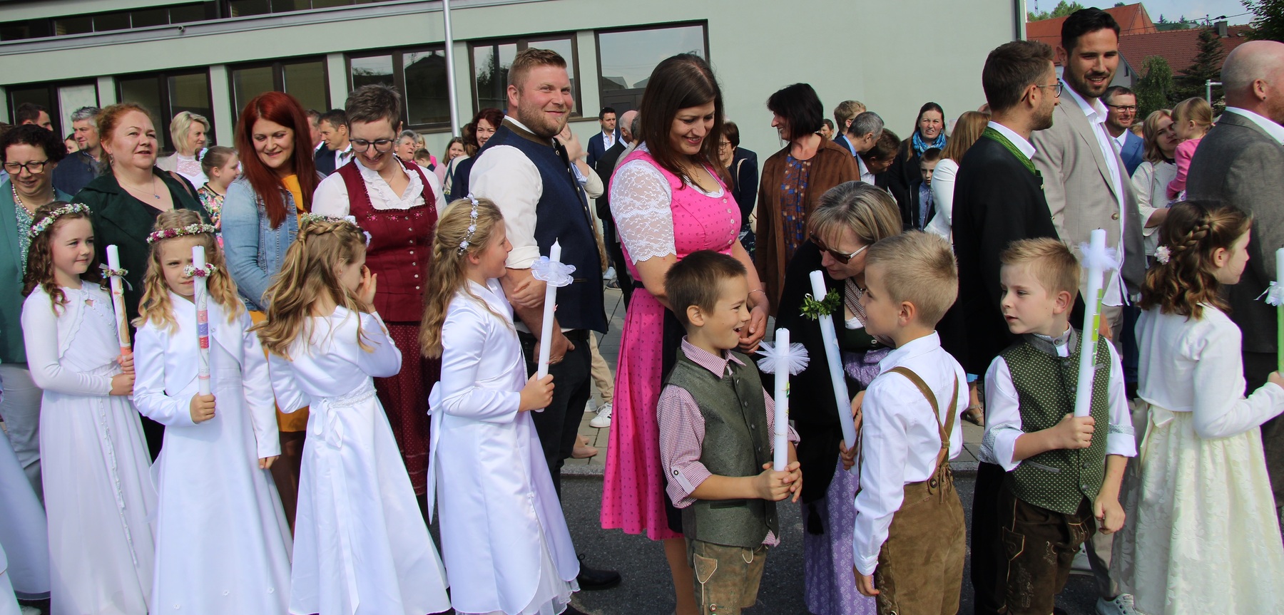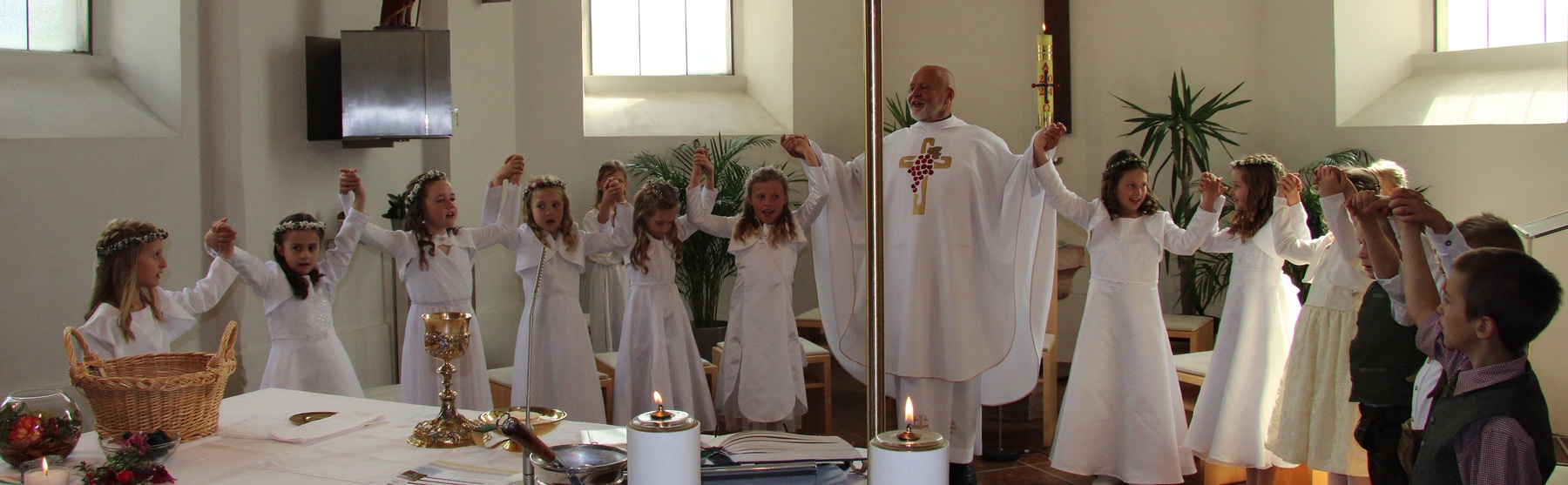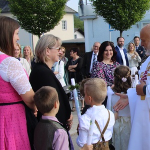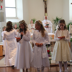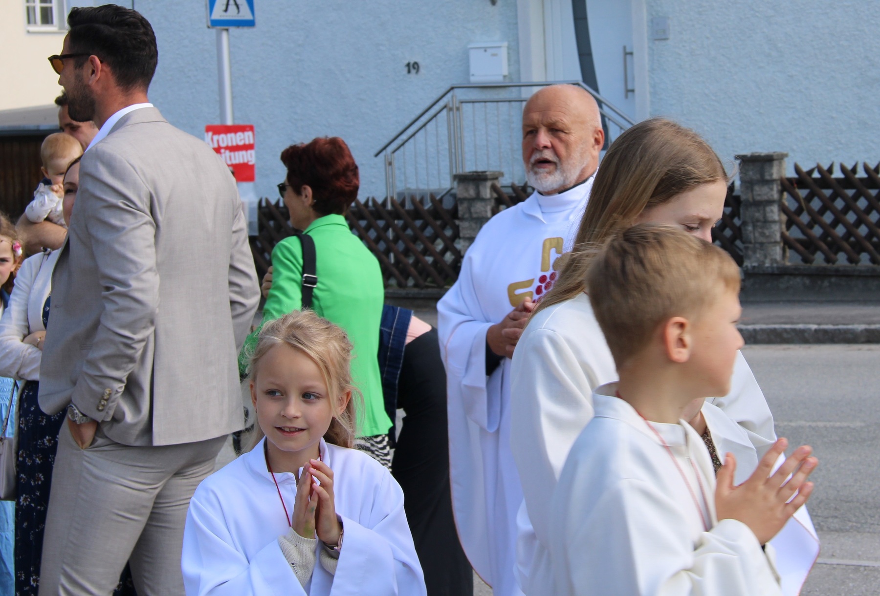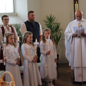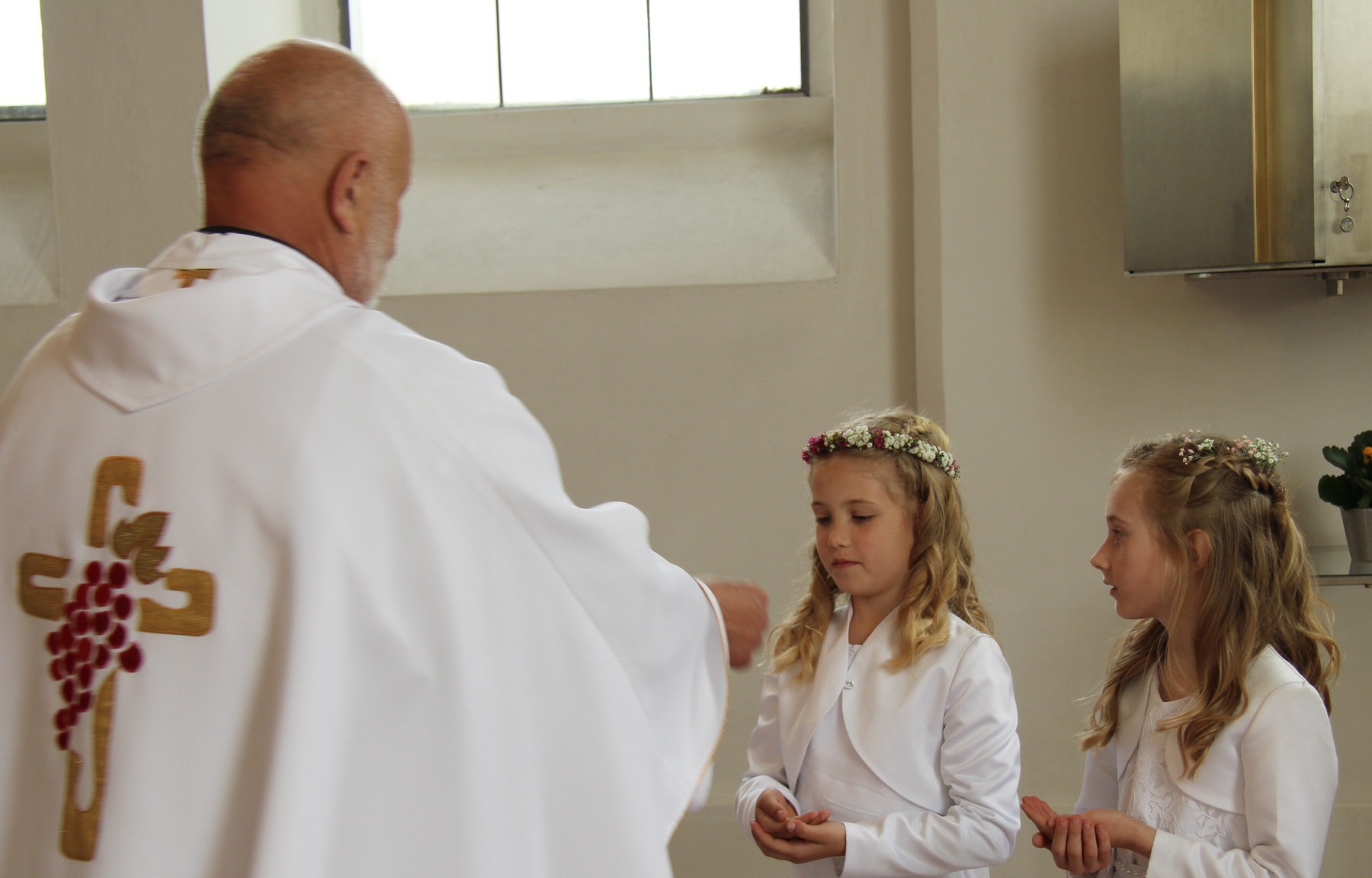 Insgesamt 12 Mädchen und Buben aus der Gemeinde Rainbach gingen am Christi Himmerfahrt zum ersten Mal an den Tisch des Herrn. Für die 12 Kinder aus Rainbach beginnt dieser Tag besonders früh.. Die Aufstellung aller Kinder fand ebenfalls traditionell vor der Schule statt. Hier trafen sich Kinder und Familien aus allen Orten, um dann ebenfalls mit schöner Blasmusik, Pfarrer Thaddäus ,und den Ministranten bei strahlendem Sonnenschein in die geschmückte und bis zum letzten Platz voll besuchte Kirche St. Peter einzuziehen. Der Festgottesdienst zur ersten heiligen Kommunion stand unter dem Motto „ Jesus ,unsere Lenensfreude“. In seiner Predigt ging Hauptzelebrant Pfarrer Thaddäus Kret darauf ein, dass natürlich jeder Mensch eingeladen ist, die Köstlichkeiten an Gottes Tisch zu genießen, Jesus lädt jeden ein an seinem Tisch zu sitzen. Diesen festen Platz bei Jesus wünschte Pfarrer thaddäus jedem Kommunionkind für die Zukunft. Für eine wunderschöne, musikalische Gestaltung des Festgottesdienstes sorgten Fam. Niedermaier mit Kinderchor.