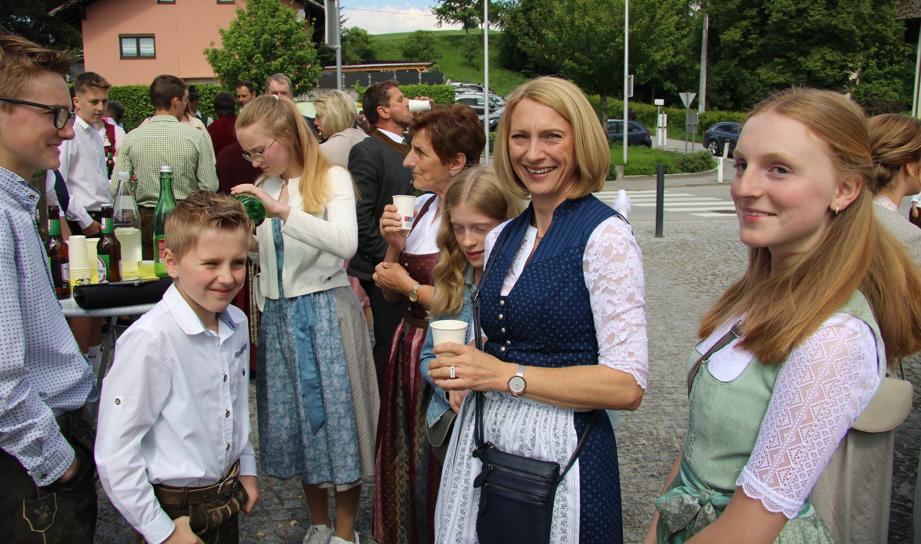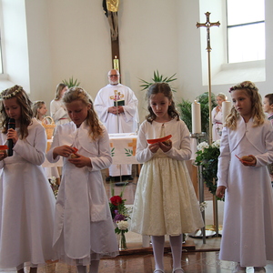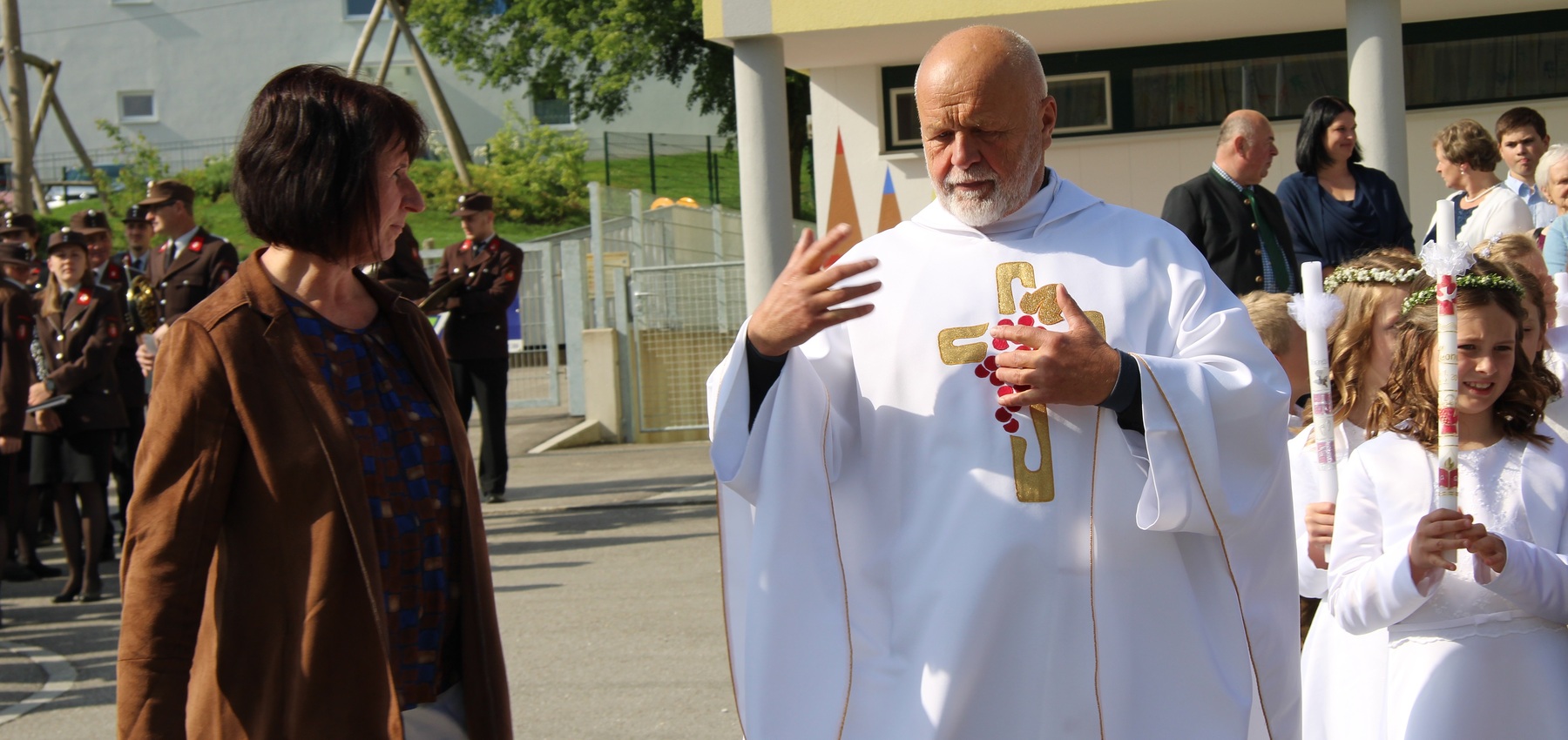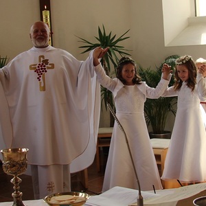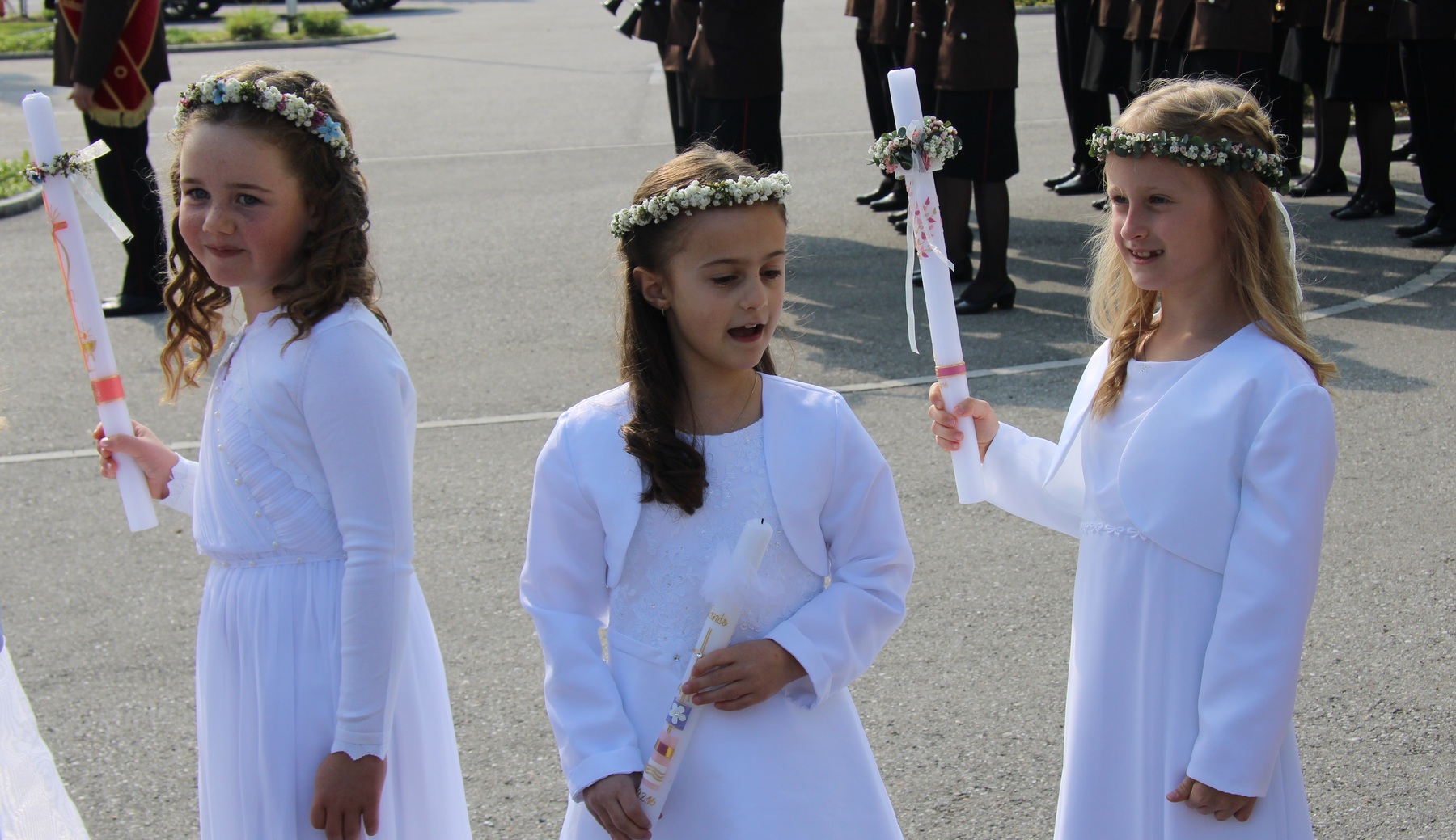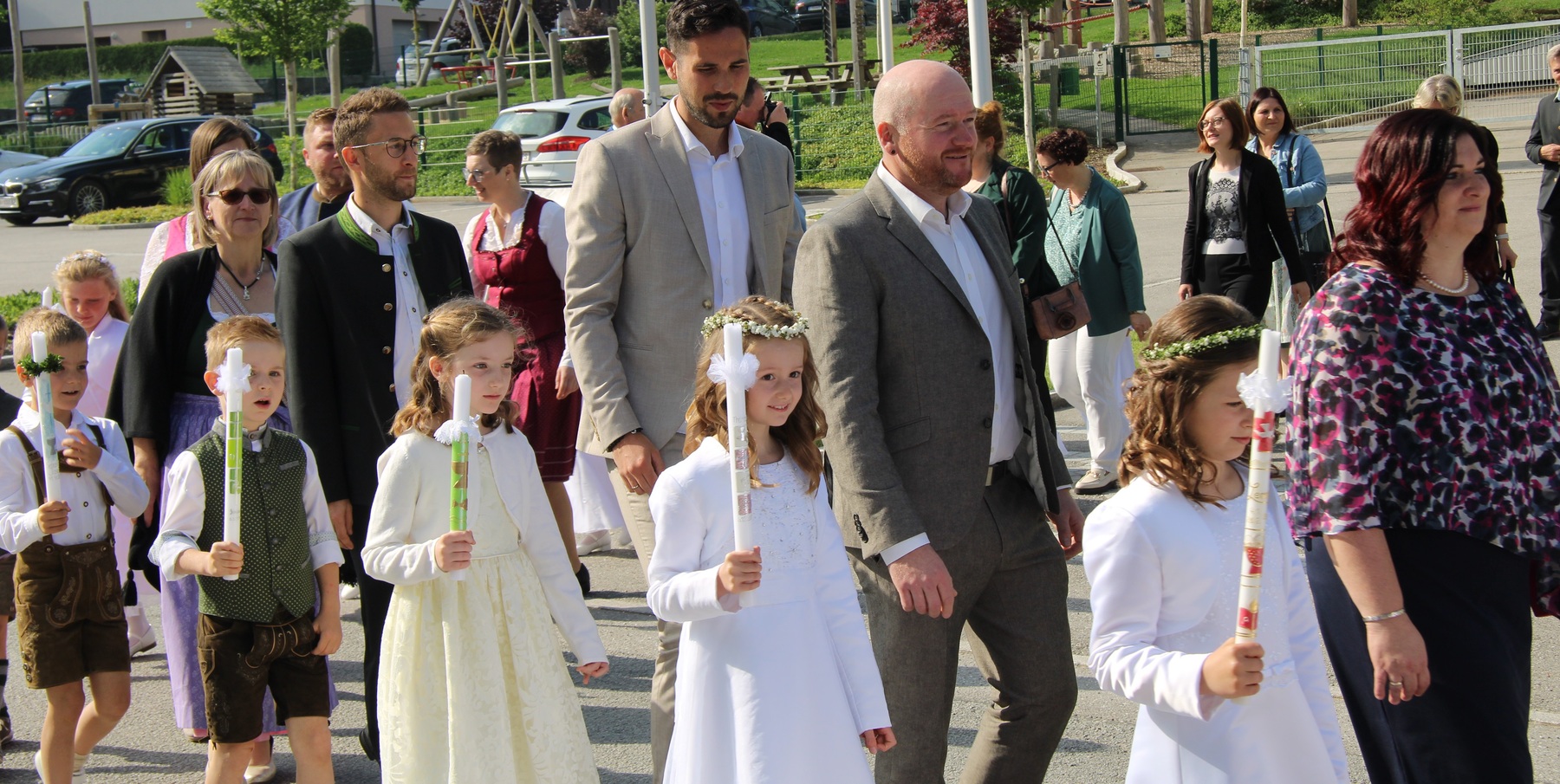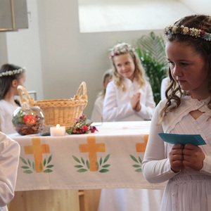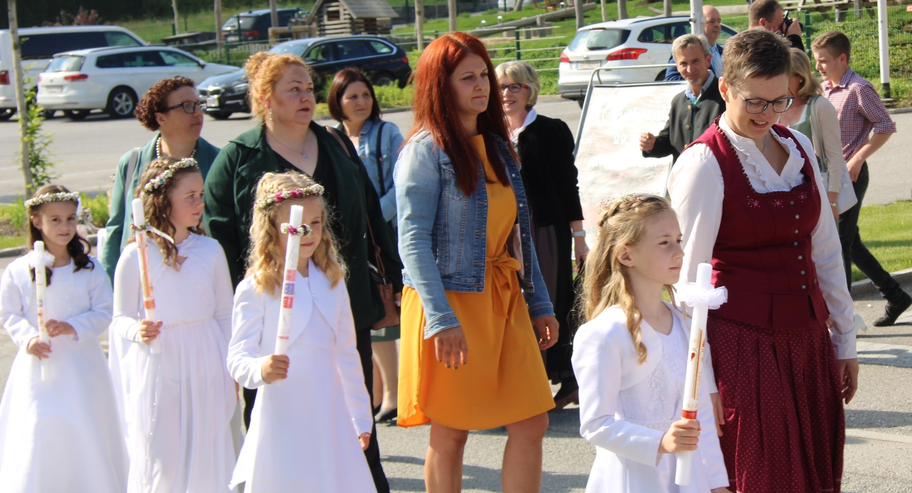 Insgesamt 12 Mädchen und Buben aus der Gemeinde Rainbach gingen am Christi Himmerfahrt zum ersten Mal an den Tisch des Herrn. Für die 12 Kinder aus Rainbach beginnt dieser Tag besonders früh.. Die Aufstellung aller Kinder fand ebenfalls traditionell vor der Schule statt. Hier trafen sich Kinder und Familien aus allen Orten, um dann ebenfalls mit schöner Blasmusik, Pfarrer Thaddäus ,und den Ministranten bei strahlendem Sonnenschein in die geschmückte und bis zum letzten Platz voll besuchte Kirche St. Peter einzuziehen. Der Festgottesdienst zur ersten heiligen Kommunion stand unter dem Motto „ Jesus ,unsere Lenensfreude“. In seiner Predigt ging Hauptzelebrant Pfarrer Thaddäus Kret darauf ein, dass natürlich jeder Mensch eingeladen ist, die Köstlichkeiten an Gottes Tisch zu genießen, Jesus lädt jeden ein an seinem Tisch zu sitzen. Diesen festen Platz bei Jesus wünschte Pfarrer thaddäus jedem Kommunionkind für die Zukunft. Für eine wunderschöne, musikalische Gestaltung des Festgottesdienstes sorgten Fam. Niedermaier mit Kinderchor.