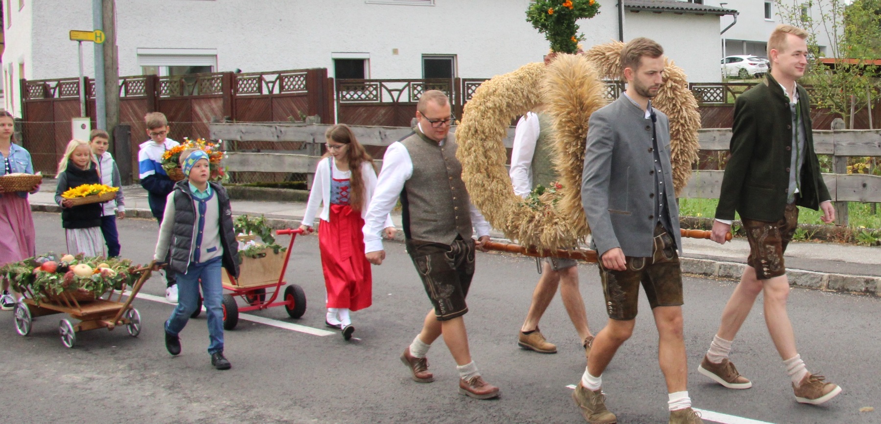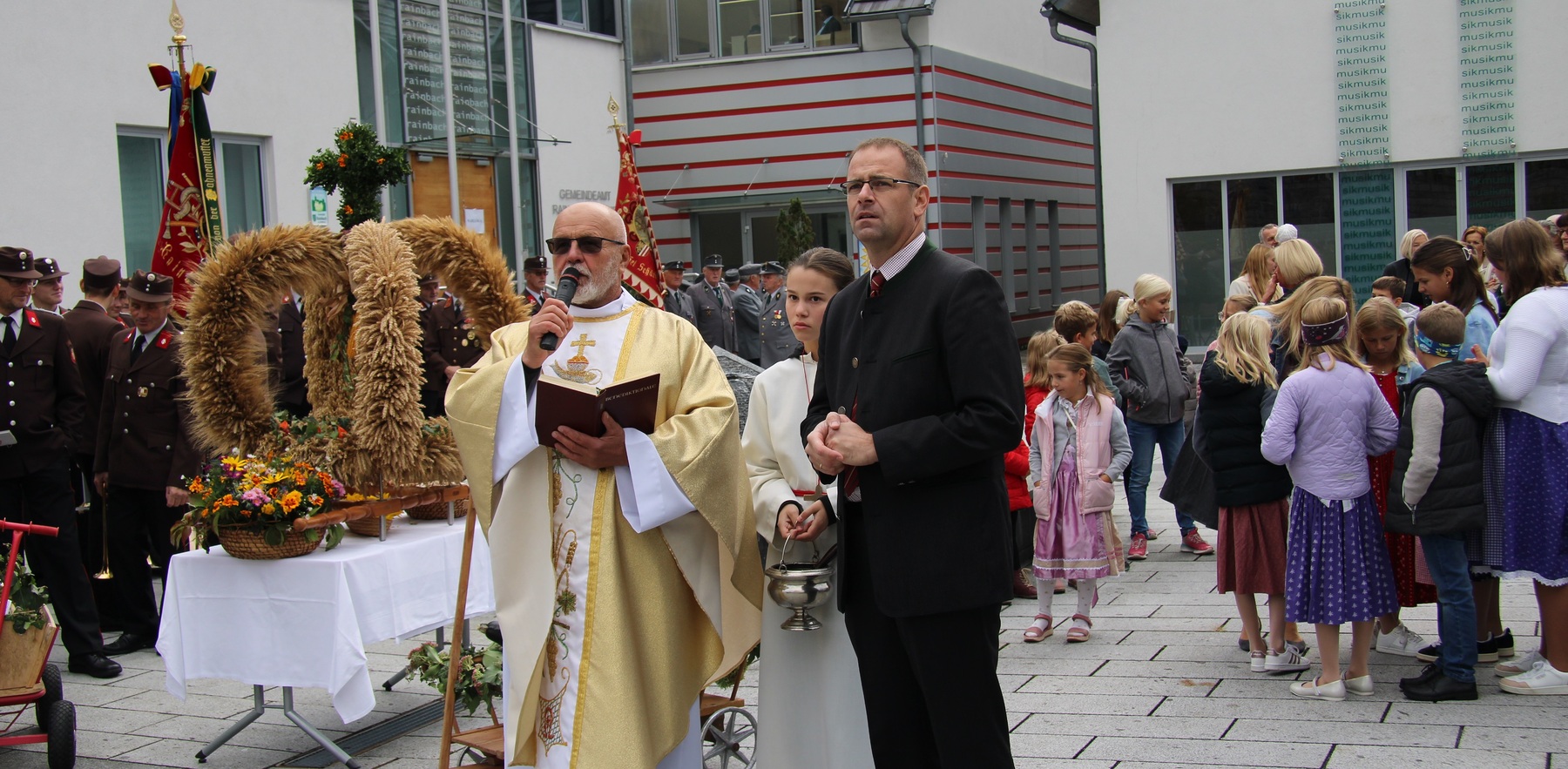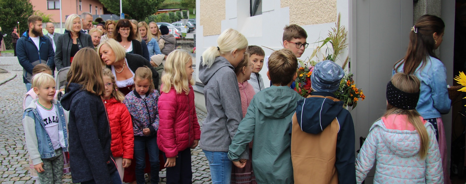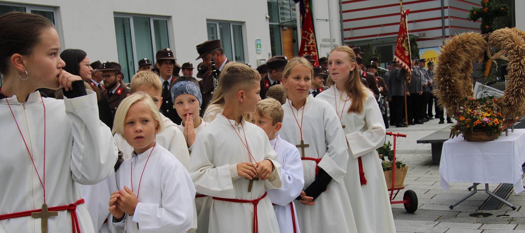Am 29. September wurde in Rainbach das Erntedankfest gefeiert. Die Ortschaft Hauzing war in diesem Jahr für die Vorbereitung des Festes verantwortlich. In der Früh traf sich die Dorfgemeinschaft bei Fam. Moritz und zog in Begleitung der Feuerwehrmusikkapelle mit der Erntekrone zum Gemeindeplatz. In der Begrüßung durch die Dorfgemeinschaft wurde auf die Bedeutung des Erntedankfestes hingewiesen. Angesichts der vielen Krisen und sinnlosen Kriege weltweit und der zahlreichen Unwetter im heurigen Jahr in und um Österreich, die so viel Zerstörung und Leid gebracht haben, sollten wir uns wieder bewusst machen, dass vieles nicht so selbstverständlich ist, wie wir es gerne glauben. Wir sollten wieder mal bewusst Dankeschön sagen, dass wir in einem Land leben dürfen, wo Frieden herrscht, in einem Ort, der von Naturkatastrophen verschont wurde und in einer Gemeinde, wo der Zusammenhalt noch funktioniert. Ganz bewusst Dankeschön sagen für die verschiedensten Ernten in der Landwirtschaft und in den Gärten, Dankeschön für Familie und Freunde, Dankeschön für die Arbeit und den Arbeitsplatz - einfach wieder einmal Vergelt’s Gott sagen für’s Leben, das wünschte die Hauzinger Dorfgemeinschaft auf dem Gemeindeplatz der Pfarrbevölkerung. Nach der feierlichen Segnung der Erntekrone durch Pfarrer Kret und der musikalischen Umrahmung durch unseren Kirchchor, führte der feierliche Festzug, angeführt von der Feuerwehrmusikkapelle, in die Pfarrkirche. Dort wurde gemeinsam mit der gesamten Pfarrbevölkerung, der Feuerwehr, Kameradschaftsbund, Landjugend, Volksschulkinder und Goldhaubenfrauen gemeinsam gebetet, gesungen und gefeiert. Zur Gabenbereitung überbrachten Kinder Körbe mit Getreide, Brot, Gemüse und Obst, sowie Blumen. Als Erinnerungsgeschenk gab es kleine Gläser mit Honig und Ausmalbilder für die Kinder. Zum Abschluss bedankte sich Pfarrer Kret auch bei der älteren Gemeindebevölkerung, deren Ehrentag heuer wieder passenderweise mit dem Erntedankfest gefeiert wurde. Gemütlich klang das Erntedankfest beim Kirchenwirt aus, wo die die ältere Generation von der Gemeinde Rainbach zum Mittagessen eingeladen wurde.