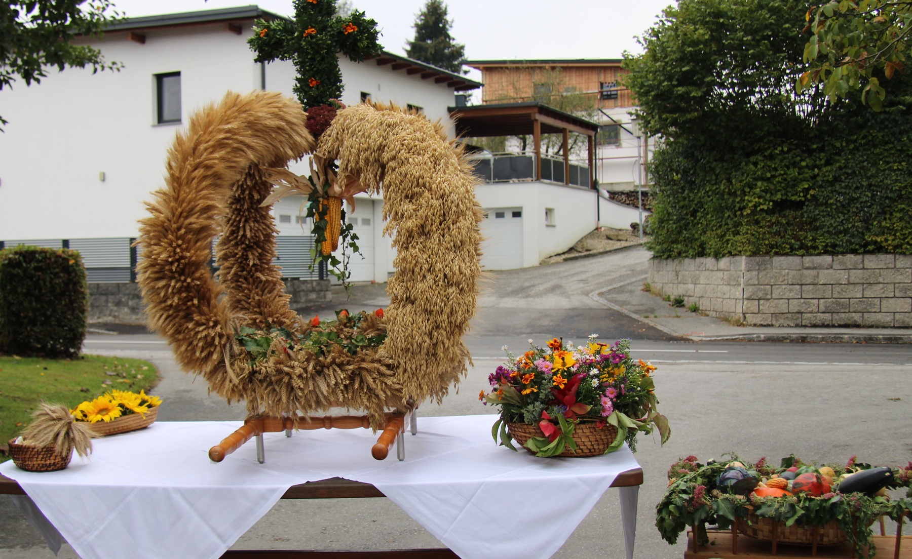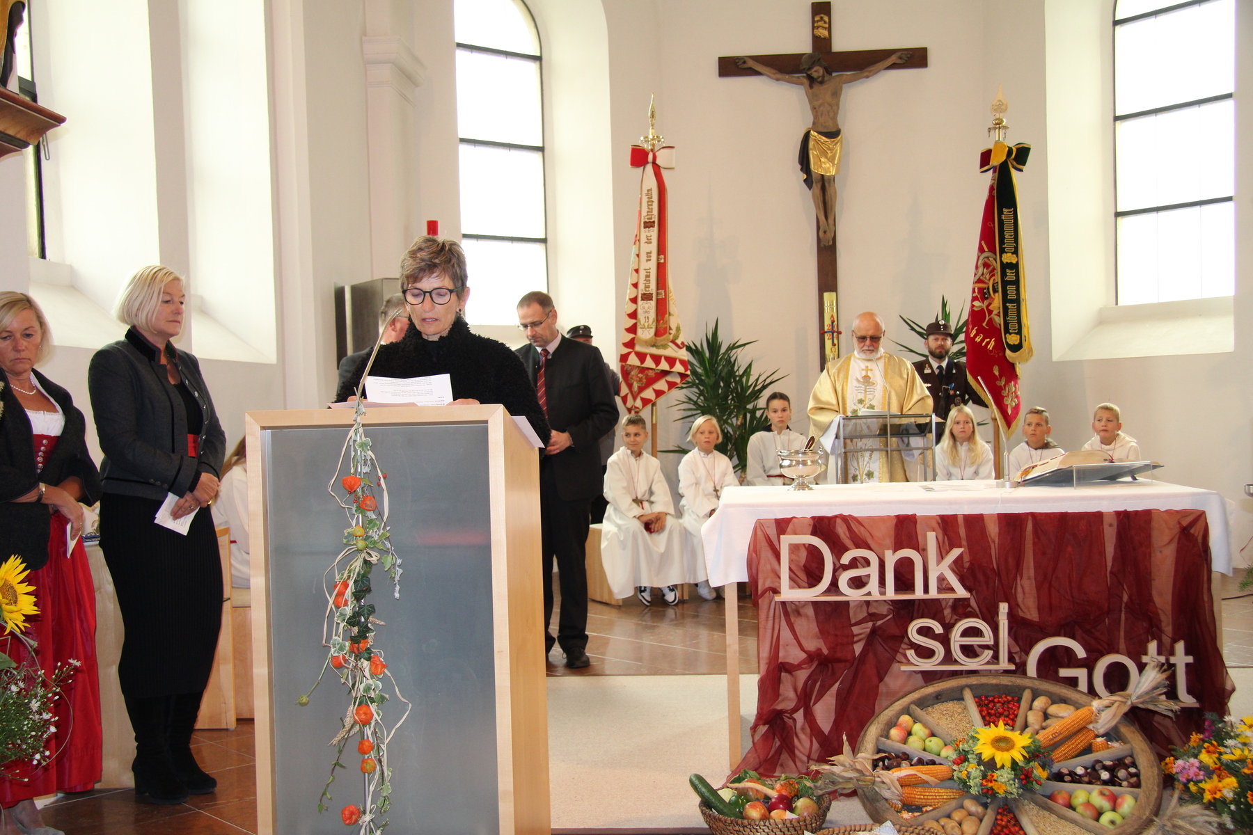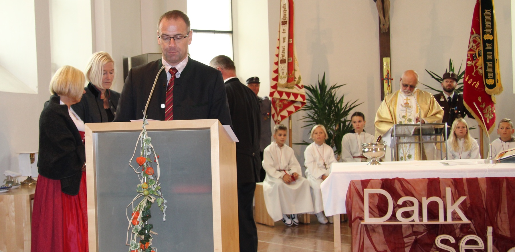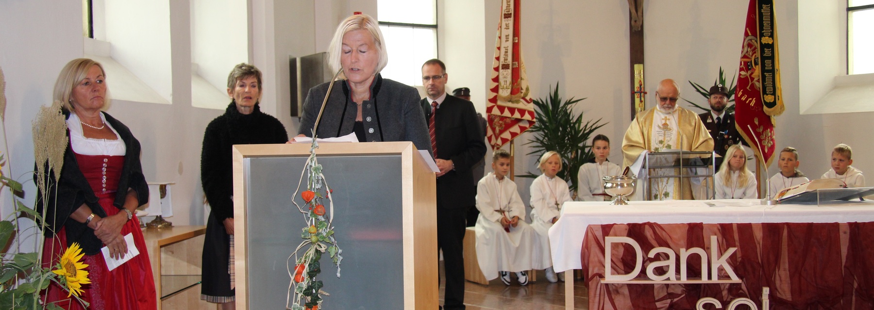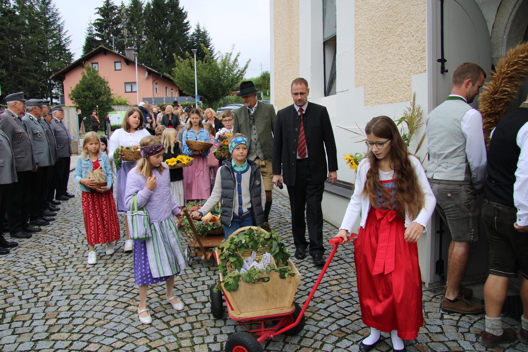 Am 29. September wurde in Rainbach das Erntedankfest gefeiert. Die Ortschaft Hauzing war in diesem Jahr für die Vorbereitung des Festes verantwortlich. In der Früh traf sich die Dorfgemeinschaft bei Fam. Moritz und zog in Begleitung der Feuerwehrmusikkapelle mit der Erntekrone zum Gemeindeplatz. In der Begrüßung durch die Dorfgemeinschaft wurde auf die Bedeutung des Erntedankfestes hingewiesen. Angesichts der vielen Krisen und sinnlosen Kriege weltweit und der zahlreichen Unwetter im heurigen Jahr in und um Österreich, die so viel Zerstörung und Leid gebracht haben, sollten wir uns wieder bewusst machen, dass vieles nicht so selbstverständlich ist, wie wir es gerne glauben. Wir sollten wieder mal bewusst Dankeschön sagen, dass wir in einem Land leben dürfen, wo Frieden herrscht, in einem Ort, der von Naturkatastrophen verschont wurde und in einer Gemeinde, wo der Zusammenhalt noch funktioniert. Ganz bewusst Dankeschön sagen für die verschiedensten Ernten in der Landwirtschaft und in den Gärten, Dankeschön für Familie und Freunde, Dankeschön für die Arbeit und den Arbeitsplatz - einfach wieder einmal Vergelt’s Gott sagen für’s Leben, das wünschte die Hauzinger Dorfgemeinschaft auf dem Gemeindeplatz der Pfarrbevölkerung. Nach der feierlichen Segnung der Erntekrone durch Pfarrer Kret und der musikalischen Umrahmung durch unseren Kirchchor, führte der feierliche Festzug, angeführt von der Feuerwehrmusikkapelle, in die Pfarrkirche. Dort wurde gemeinsam mit der gesamten Pfarrbevölkerung, der Feuerwehr, Kameradschaftsbund, Landjugend, Volksschulkinder und Goldhaubenfrauen gemeinsam gebetet, gesungen und gefeiert. Zur Gabenbereitung überbrachten Kinder Körbe mit Getreide, Brot, Gemüse und Obst, sowie Blumen. Als Erinnerungsgeschenk gab es kleine Gläser mit Honig und Ausmalbilder für die Kinder. Zum Abschluss bedankte sich Pfarrer Kret auch bei der älteren Gemeindebevölkerung, deren Ehrentag heuer wieder passenderweise mit dem Erntedankfest gefeiert wurde. Gemütlich klang das Erntedankfest beim Kirchenwirt aus, wo die die ältere Generation von der Gemeinde Rainbach zum Mittagessen eingeladen wurde.