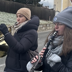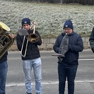 Musikkapelle Rainbach beim Neujahrsanblasen beim Pfarrer Thaddäus Prosit Neujahr 2025