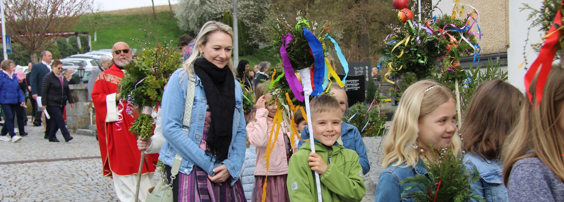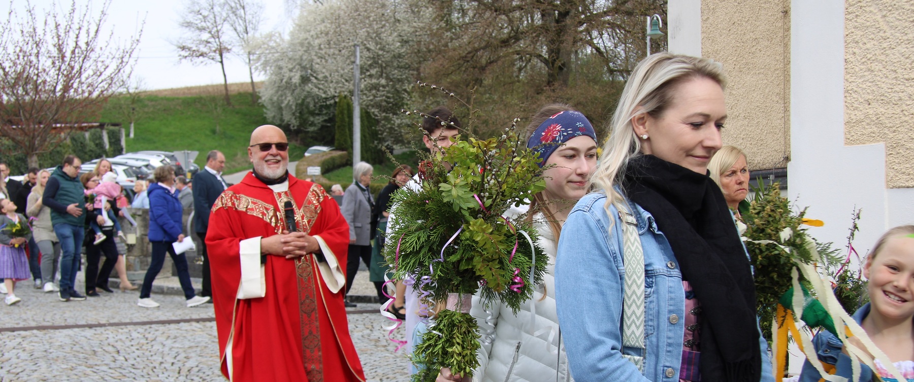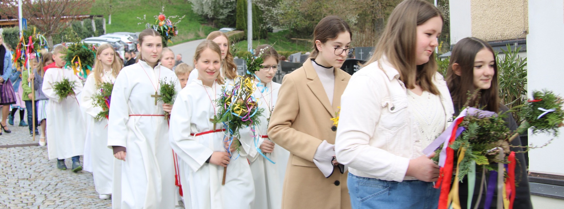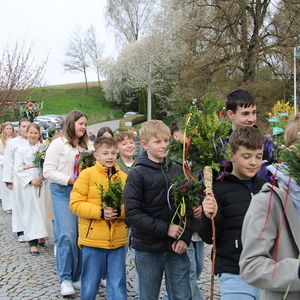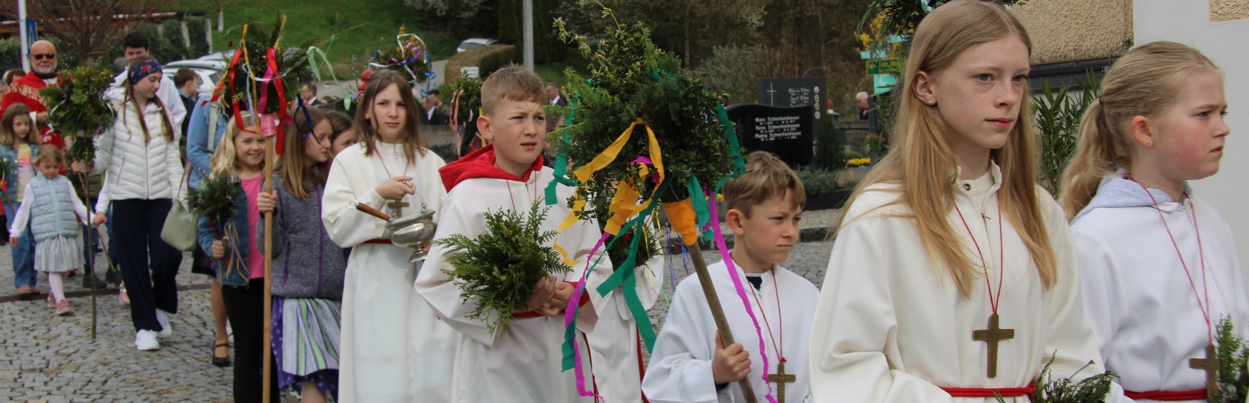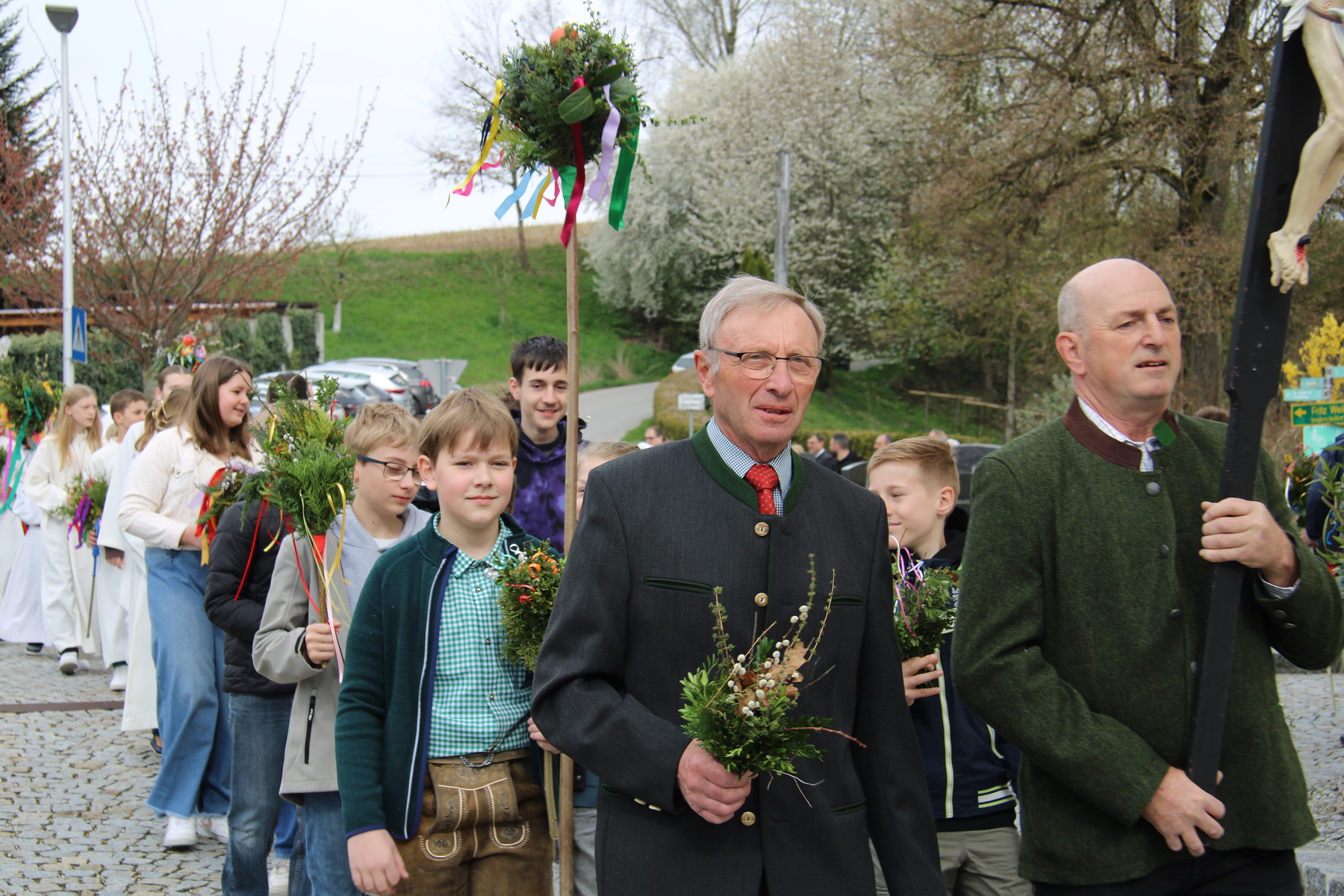 Jesus zieht auf einem Esel in Jerusalem ein und wird von den Menschen wie ein König geehrt. In Erinnerung daran zog unsere Pfarrgemeinde auch heuer wieder in einer feierlichen Prozession von der Gemeindeplatz zur Pfarrkirche, wo eine feierliche Messe stattfand.