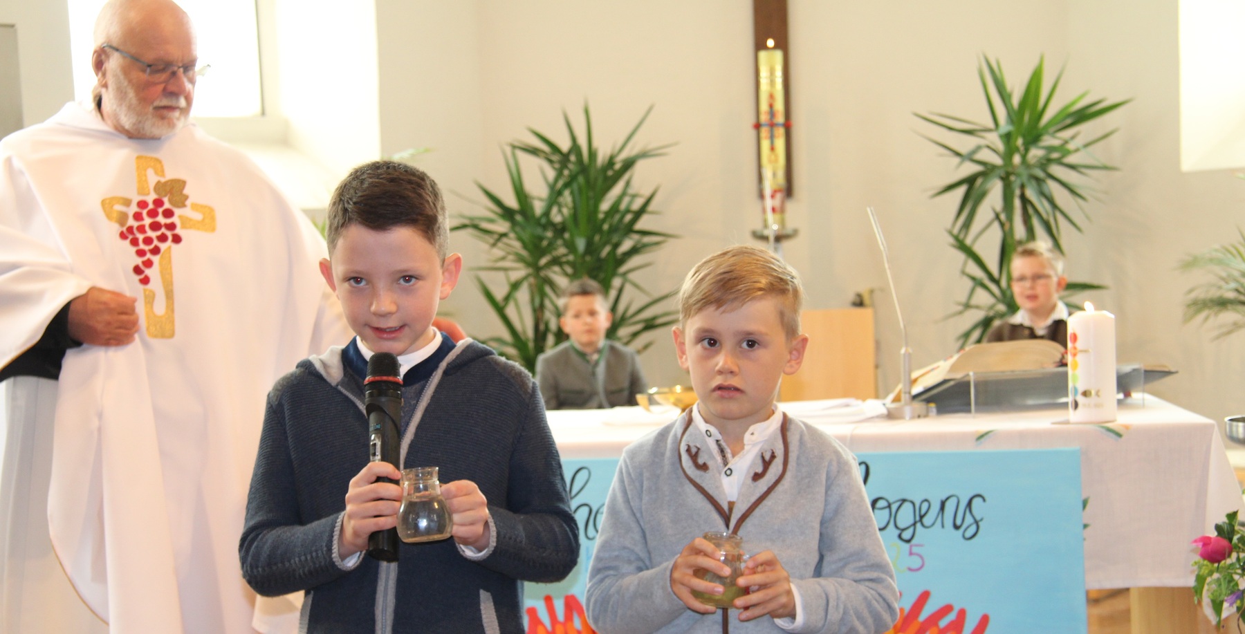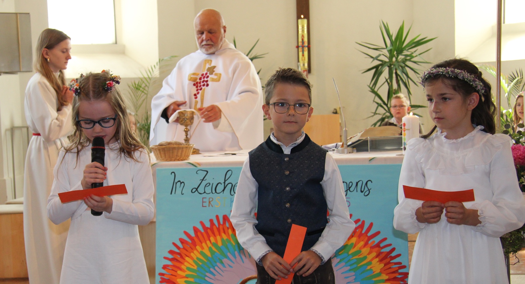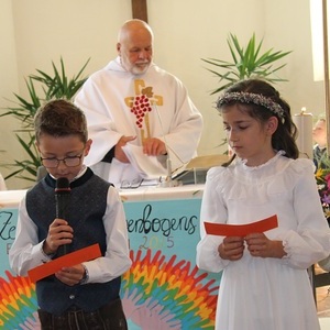Vom bunten Regenbogen – dem Motto der Erstkommunion – handelten die “Der bunte Regenbogen symbolisiert die Verbindung zwischen Gott und uns Menschen”, so Pfarrer Thaddäus