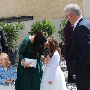 Wenn die Sonne durch den Regenbogen scheint, erleben wir dieses faszinierende Wunder der Natur. Der Regenbogen ist ein leuchtendes Zeichen dafür, dass Gott und Mensch miteinander verbunden sind. Am Tag der Erstkommunion bringt Jesus ganz besonders viel Farbe in das Leben der Kinder- in einem kleinen Stückchen Brot, in dem alles Leben steckt mit all den Farben des Regenbogens.