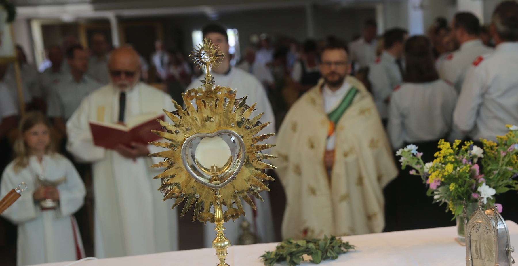 Zum Fronleichnamsfest: Es ist nach wie vor in weiten Teilen unseres Landes beliebt und fest im Leben der Menschen verankert. Was ist das Besondere an Fronleichnam? Einmal im Jahr wird die Verehrung, die Liebe zu dieser ganz besonderen Gegenwart Jesu unter uns Menschen öffentlich sichtbar gemacht. In der Gestalt der Hostie „besucht“ Jesus selber unsere Dörfer und Städte und segnet die Menschen und das Land. Jesus hat ja verheißen: „Ich bin bei euch alle Tage bis zum Ende der Welt.“ Das darf am heutigen Festtag als etwas besonders Hoffnungsvolles gefeiert werden.