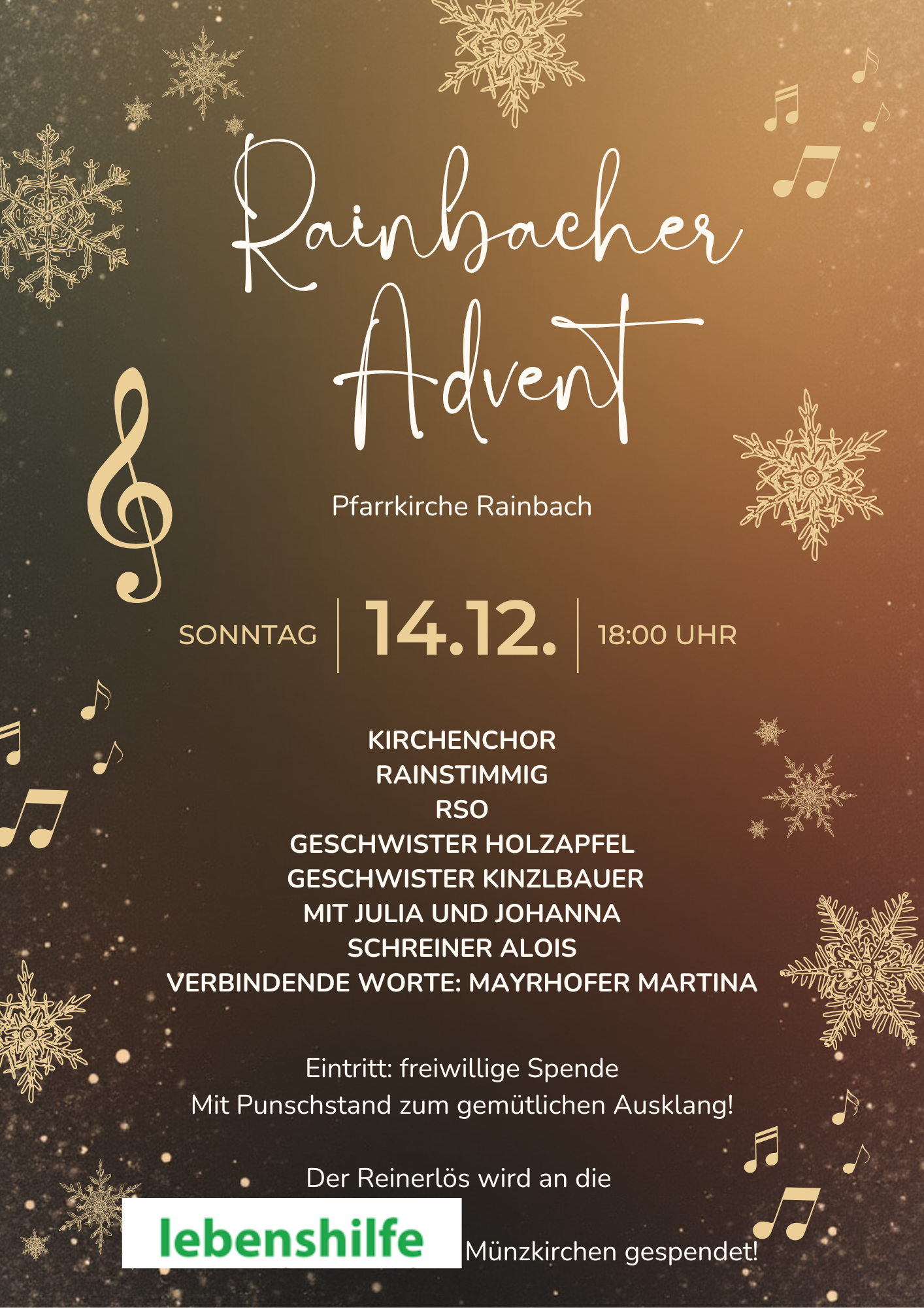 Der anschließende Bildbericht zeigt auch den stimmungsvollen Glühweinstand und Keksen vor der Rainbacher Kirche, der von der Rainbacher Pfarrgemeinschaft gemeinsam mit den Veranstaltern organisiert wurde und eine gelungene Abrundung des Adventkonzertes darstellte.