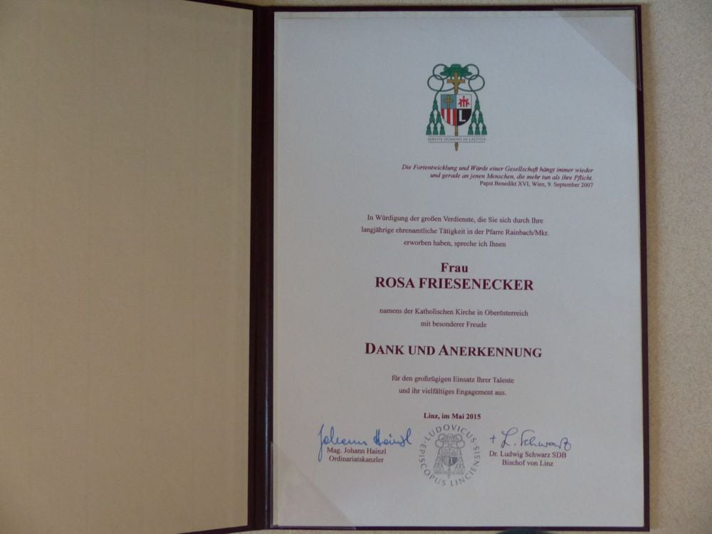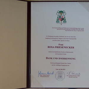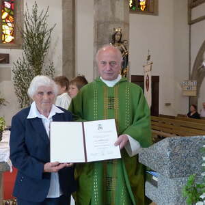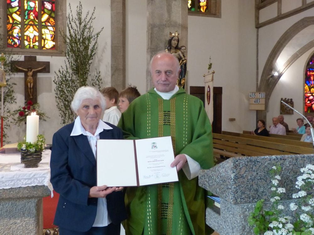 Seit 30 Jahren schmückt Frau Rosa Friesenecker die Priestergräber, gibt Blumen für den Kirchenschmuck zu Weihnachten, Ostern und zu anderen Anlässen. Und zum Fronleichnamsfest bindet sie seit 25 Jahren 17 Blumenkränzchen für den Traghimmel, die Laternen etc.
