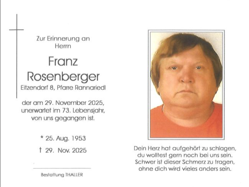 Die Totenwache für Franz Rosenberger ist am Donnerstag, 4.12.2025 um 19.00 Uhr und Freitag, 5.12.2025 um 13:30 Uhr