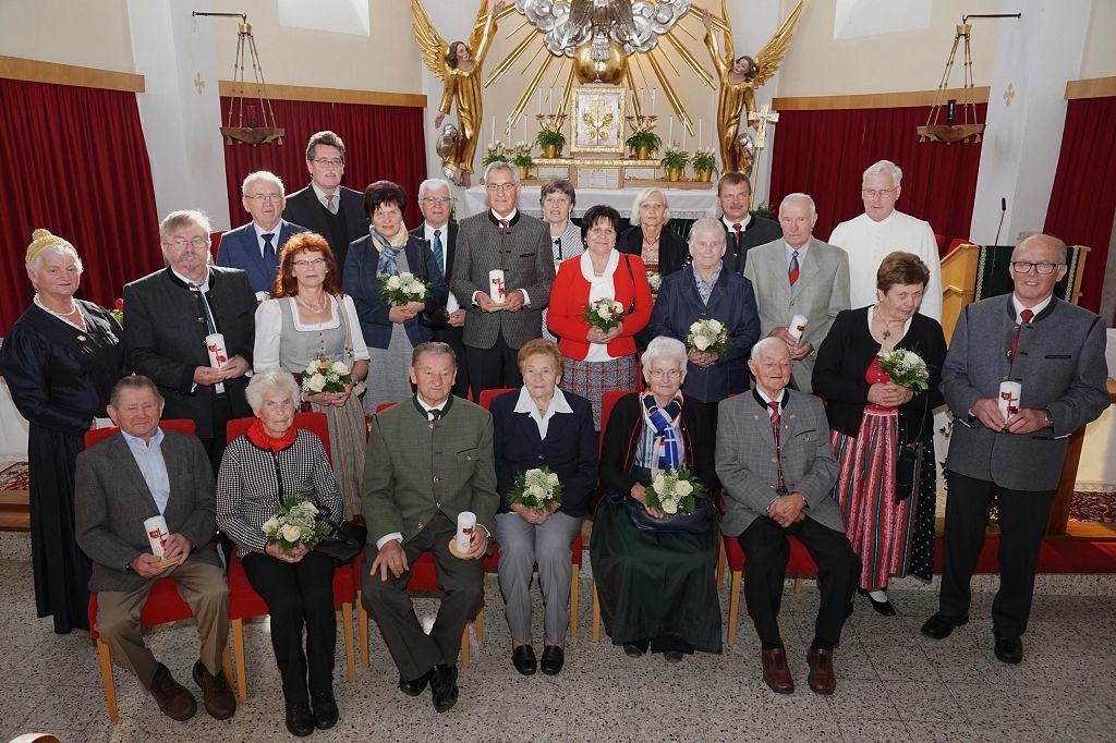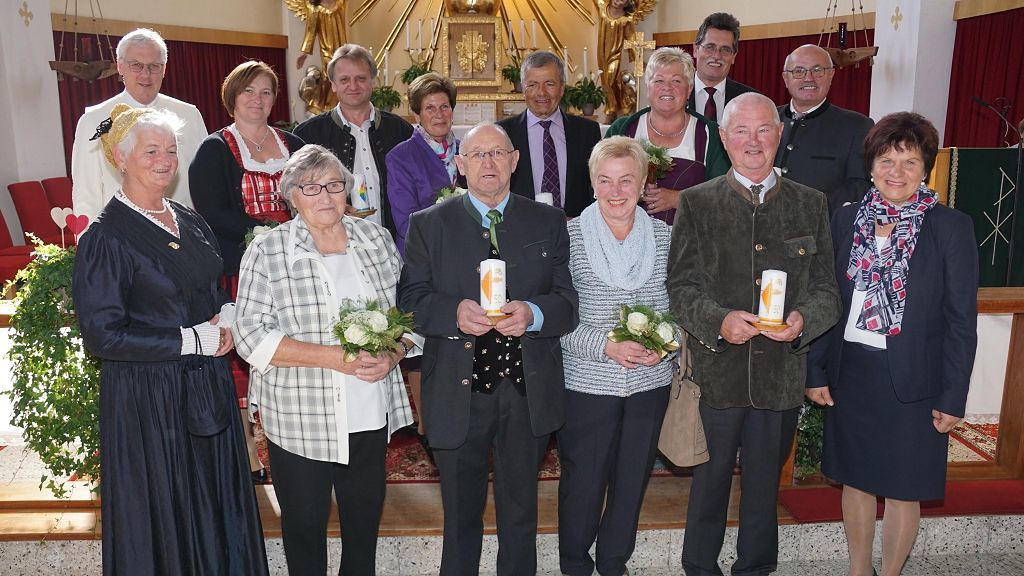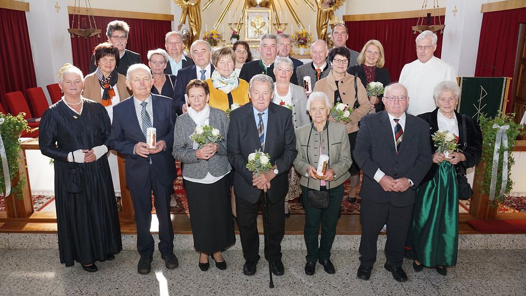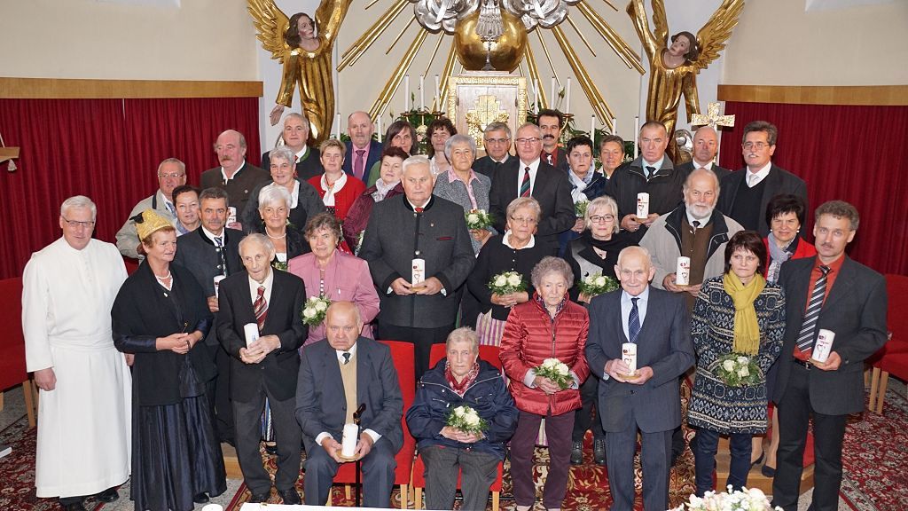 Pfarre, KFB und Goldhaubengruppe laden zu einem festlichen Gottesdienst, der vom Kirchenchor umrahmt und von der Musikapelle aufgespielt wird. Es werden alle Paare eingeladen, die vor 25, 40, 50, 60 oder 65 Jahren aus der Pfarre oder in der Pfarre geheiratet haben.