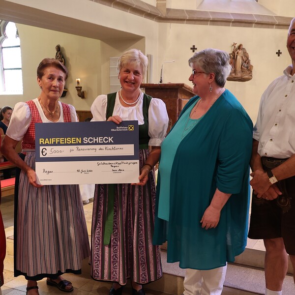 Mit einem großzügigen Geschenk für die Pfarre stellte sich die Goldhauben- und Kopftuchgruppe Regau beim Patrozinium ein. Sie übergab beim Gottesdienst 5.000,- Euro für die notwendige Sanierung unseres Kirchturmes. Ein wertvoller Beitrag für uns als Pfarre.