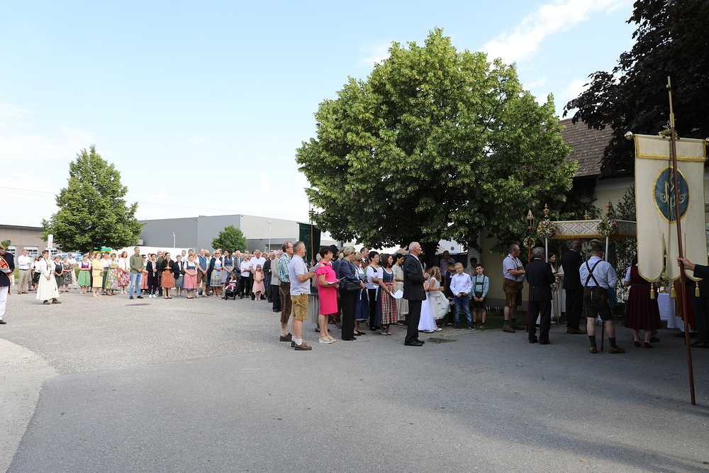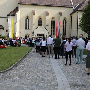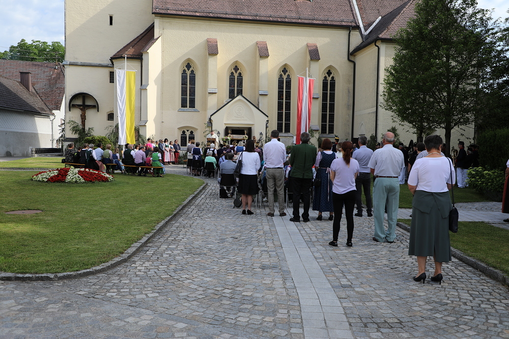 Viele Jahre bzw. sogar Jahrzehnte lang haben einzelne Familien die Altäre entlang des Prozessionsweges aufgestellt und geschmückt. Aus verschiedenen Gründen ist dies nicht mehr allen möglich. Die Prozession führte deshalb heuer vom Kirchenvorplatz auf der Marktstraße zum Pfarrhof (1. Altar), weiter zum Kindergarten (2. Altar), zum Friedhof (3. Altar) und am Friedensweg zurück zur Kirche.