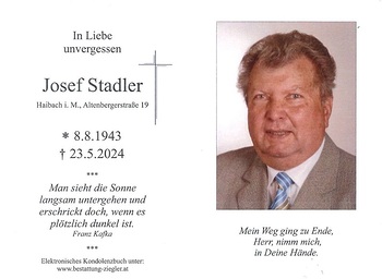 Der Trauergottesdienst von Josef Jobst findet am Freitag, den 19. Juli 2024 um 10:00 Uhr in der Kirche statt, wir beten für ihn am Donnertag den 18. Juli 2024 um 19:30 Uhr.