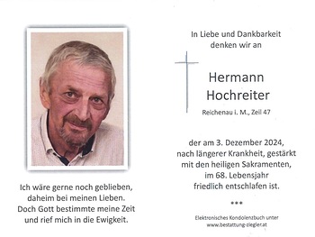 Das Begräbnis findet am Donnerstag, den 2. Jänner 2025 um 14:00 Uhr in Reichenau statt.