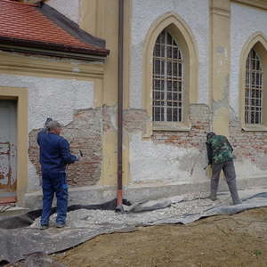 Mitte April 2016 - wie geplant - konnten die Vorarbeiten zur Sanierung der Außenfassade mit dem Teilabbruch des Putzes begonnen werden.