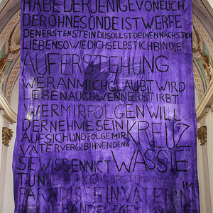 Bewusst entschied man sich nicht ein fertiges Tuch zu kaufen, sondern die Pfarrgemeinde um „Tuchspenden“ zu bitten. Es wurden Bettlacken und Leintücher der ganzen Pfarrgemeinde zu einem großen Tuch zusammengenäht. So hat die ganze Pfarre mit dem Projekt etwas zu tun. Auf dem lila grundierten, 6m x 9m (54m2) großen Tuch sind in schwarzer, durchgehender Schrift, Zitate Jesu zu sehen.