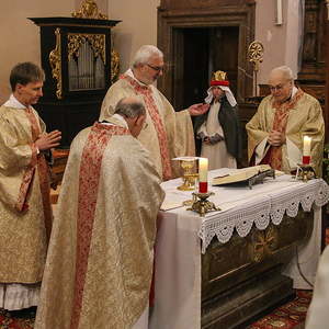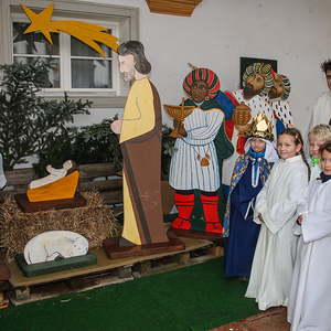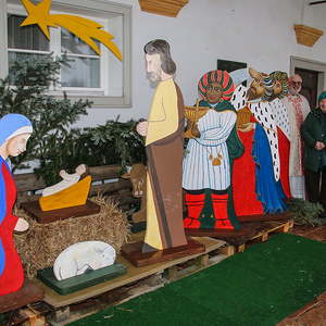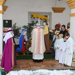 Vor dem Schlußsegen wurde die Bretterkrippe im Arkadengang gesegnet, welche heuer durch 3 Königsfiguren ergänzt wurde.